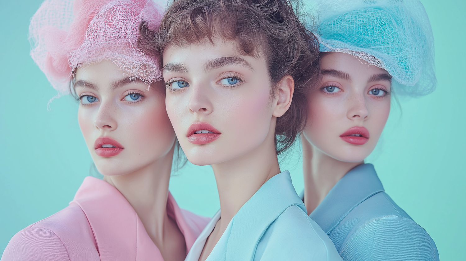 Three women in pastel outfits and netted hats pose against a turquoise background, showcasing soft makeup and striking blue eyes.