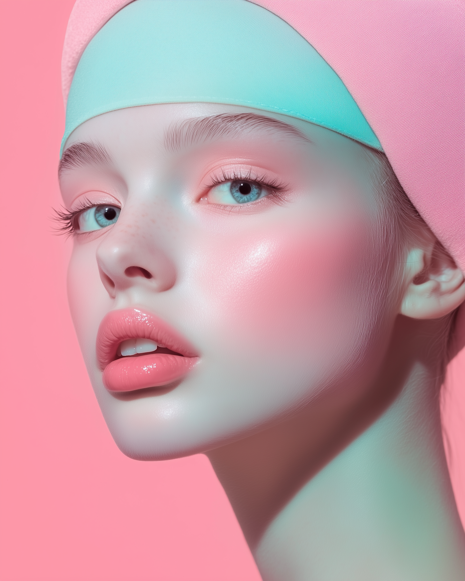 A serene portrait of a young woman with blue eyes, pink lips, and a pastel headscarf against a pink background.