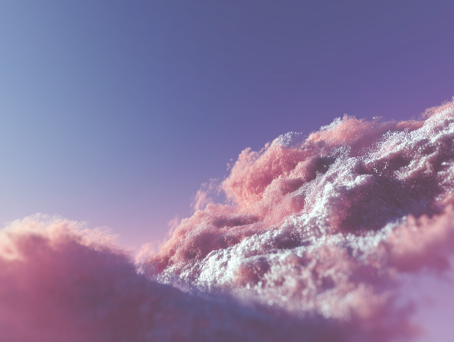 A dreamy scene of pink, fluffy clouds against a gradient purple-blue sky, evoking a surreal and tranquil atmosphere.