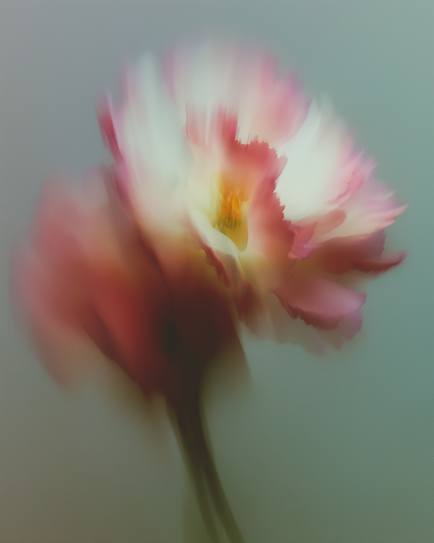 A dreamy, soft-focus image of a pink and white flower with a yellow center, set against a muted background.
