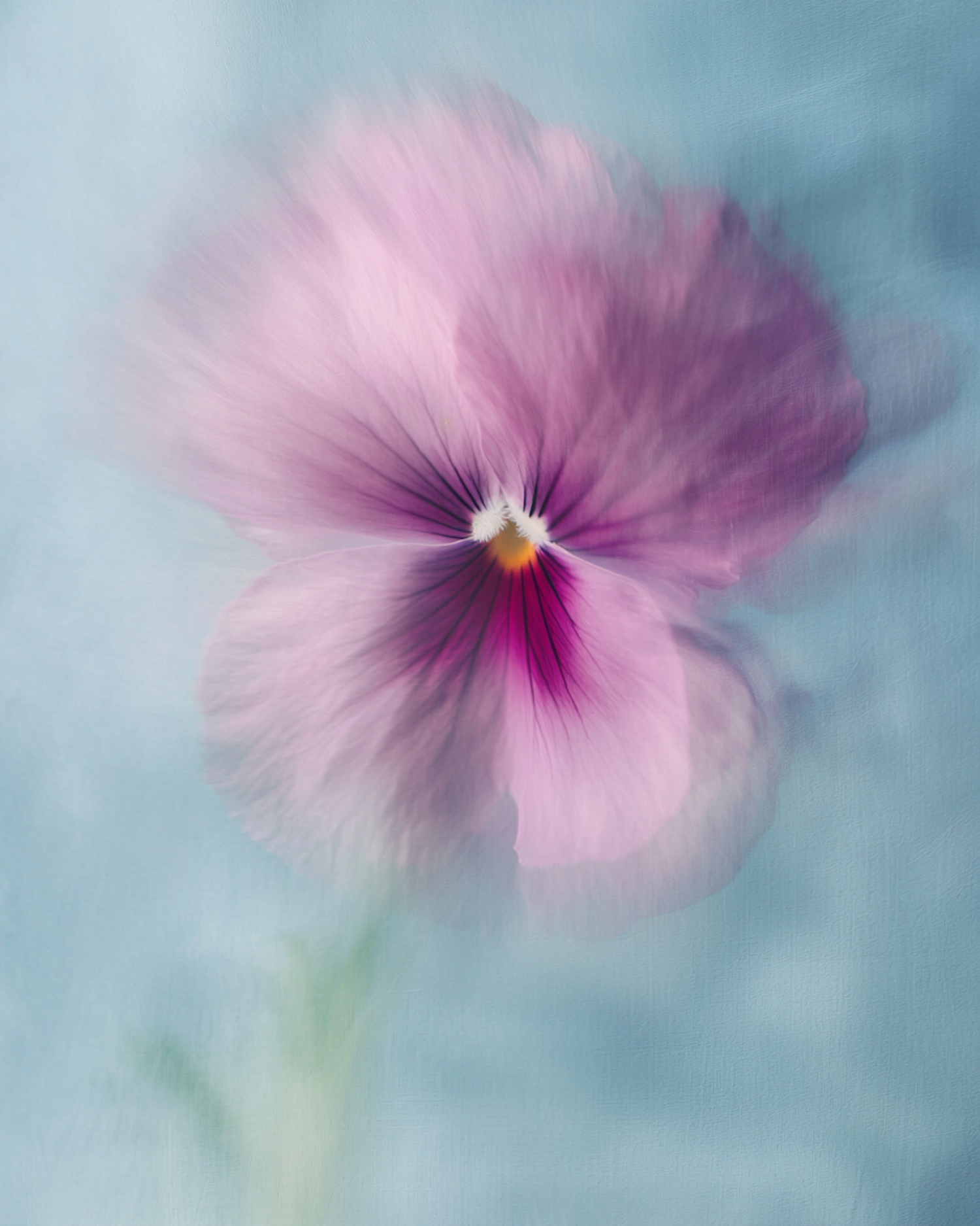 Dreamy close-up of a pink pansy with soft petals and a muted blue background, perfect for serene and artistic floral inspiration.