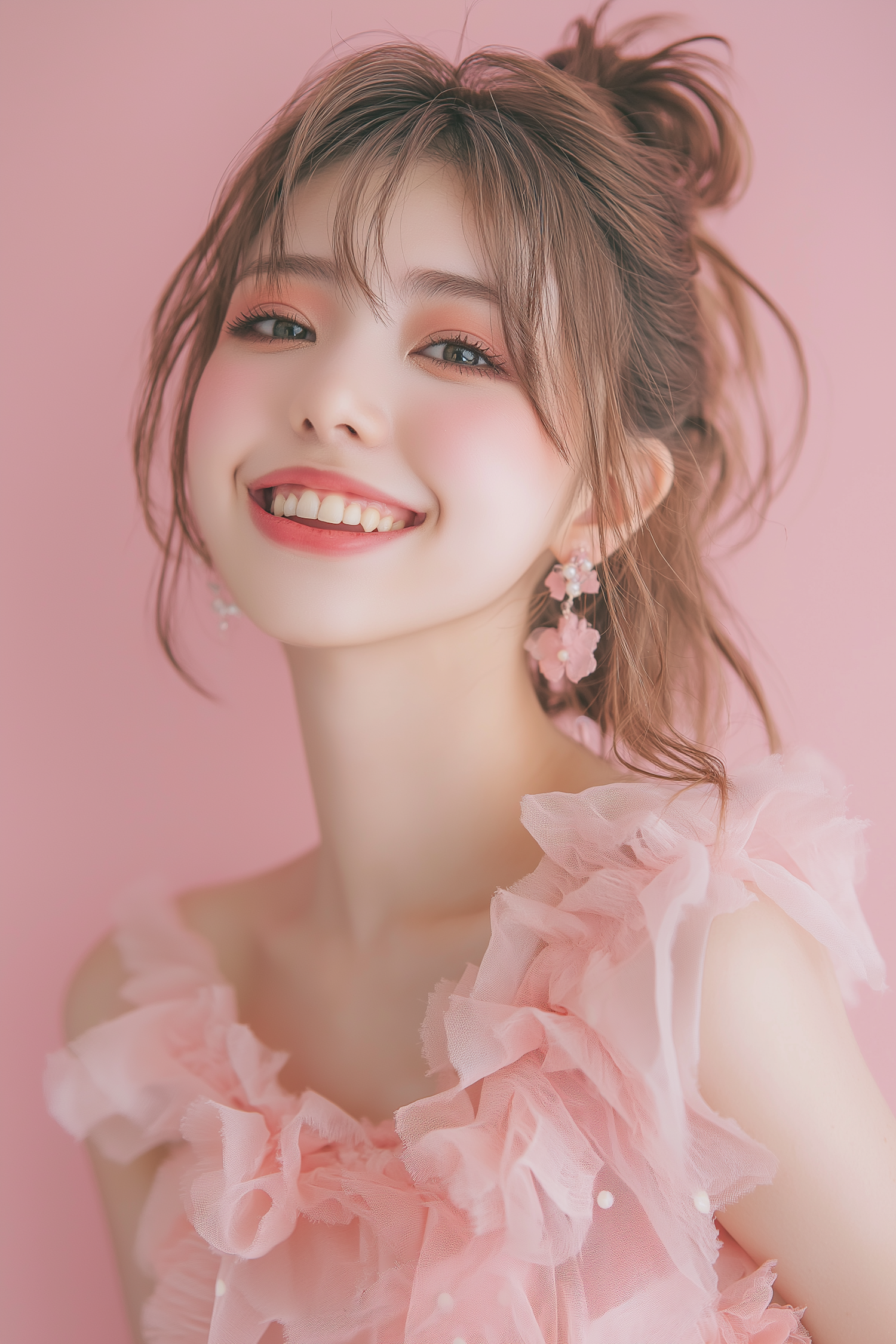 Brightly smiling woman in a pink ruffled dress with floral earrings, styled against a soft pink background for a dreamy, feminine vibe.