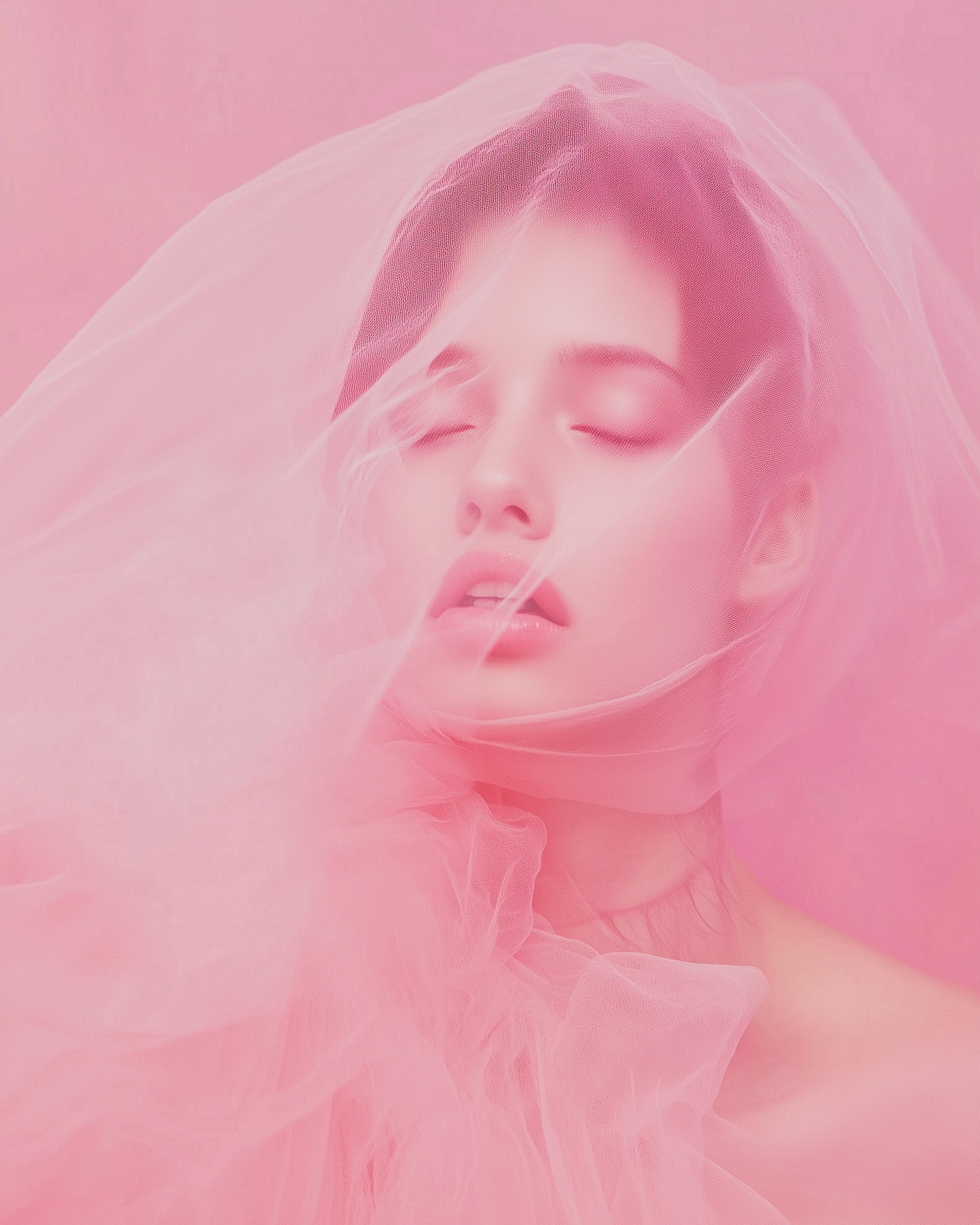 Ethereal portrait of a woman enveloped in pink tulle, eyes closed, creating a dreamy and serene atmosphere.