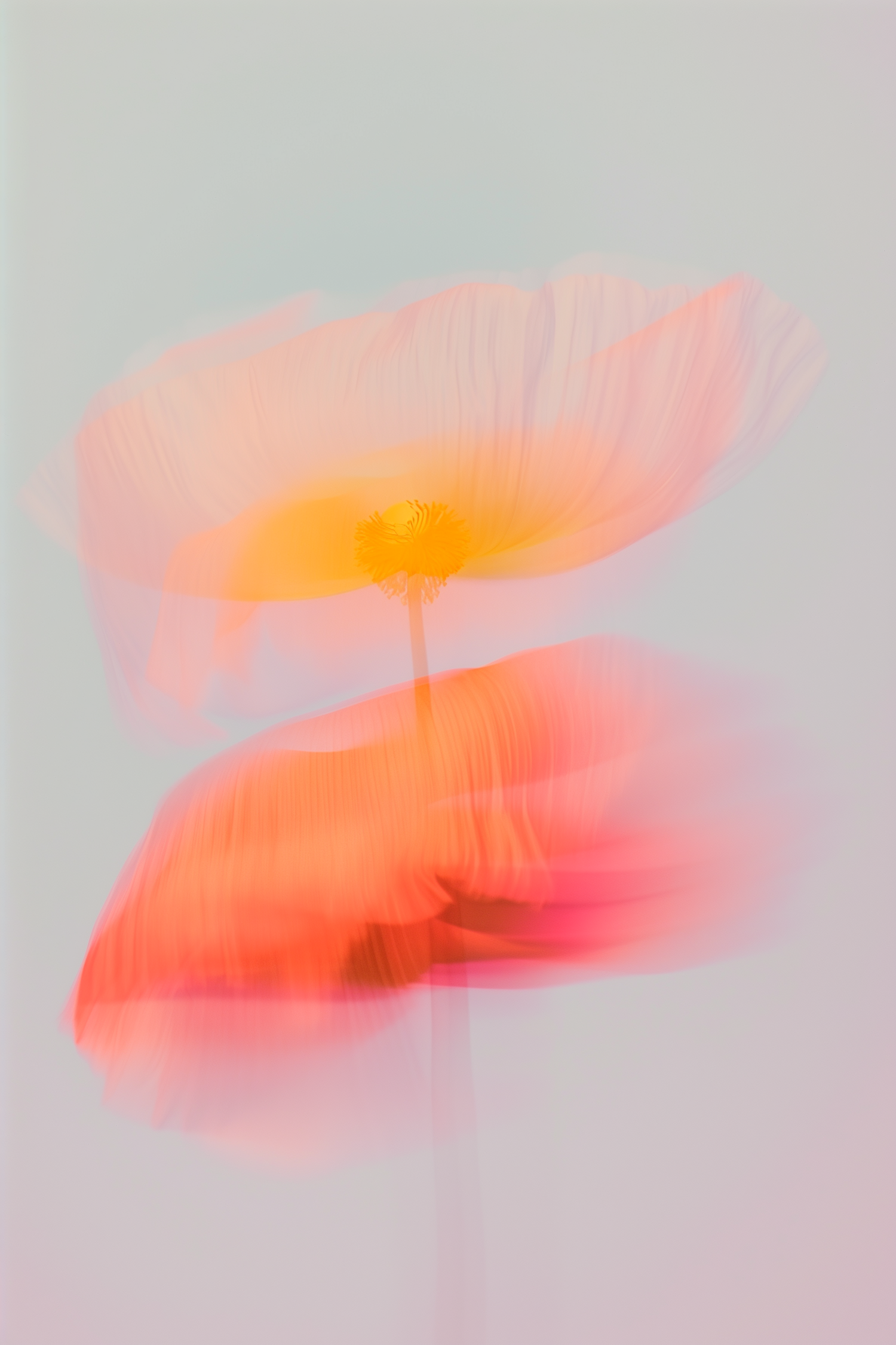 Abstract image of two blurred poppy flowers in yellow and coral pink tones, set against a soft gray background.