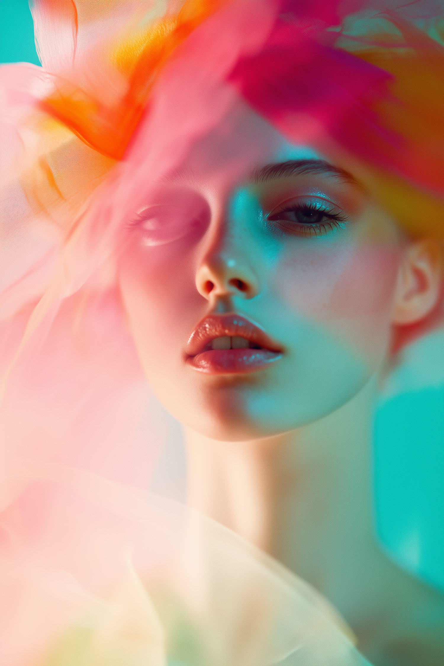 A dreamy close-up portrait of a woman surrounded by vibrant pink, orange, and teal hues, with soft lighting and ethereal textures.
