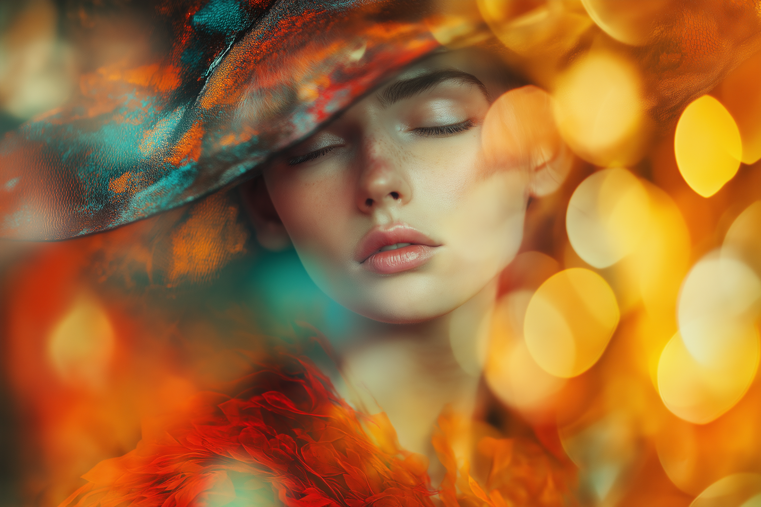 Dreamy close-up of a serene woman in a vibrant teal and orange hat, surrounded by warm golden bokeh and fiery hues.