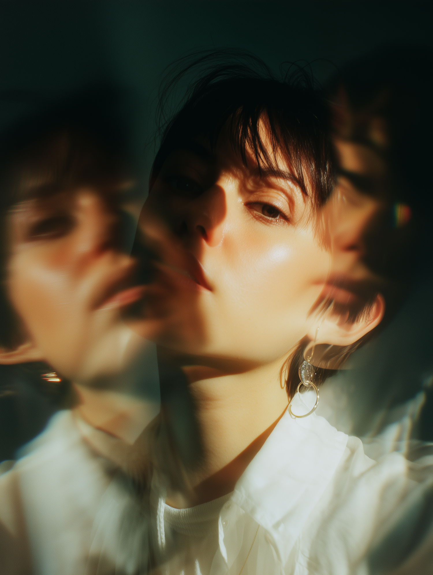Dreamy close-up portrait with soft lighting, reflections, and artistic distortions. Features a person with short dark hair and glowing skin.