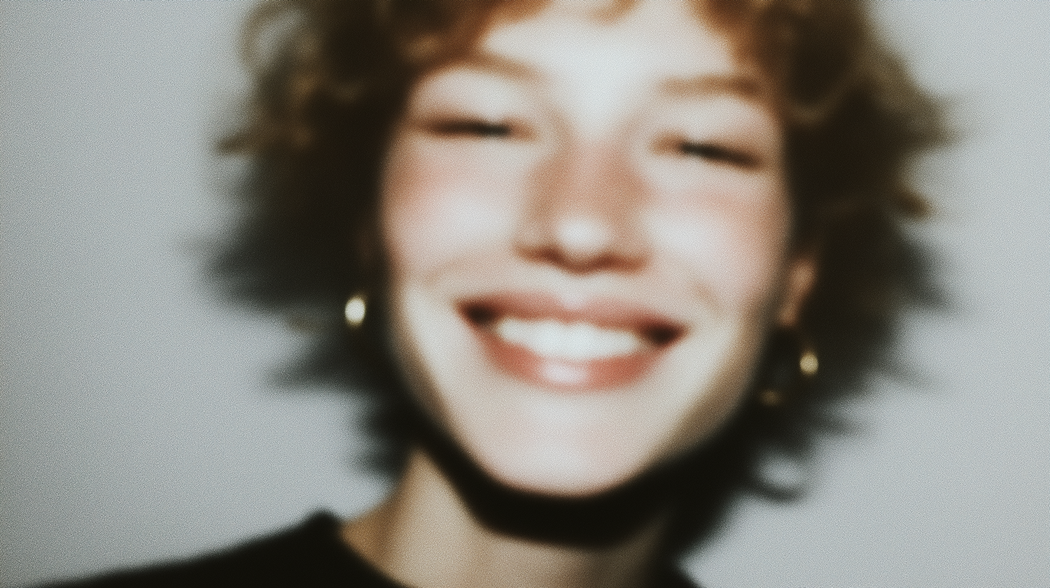 Blurred close-up of a smiling person with short curly hair, gold hoop earrings, and a dreamy aesthetic. Soft focus adds artistic charm.