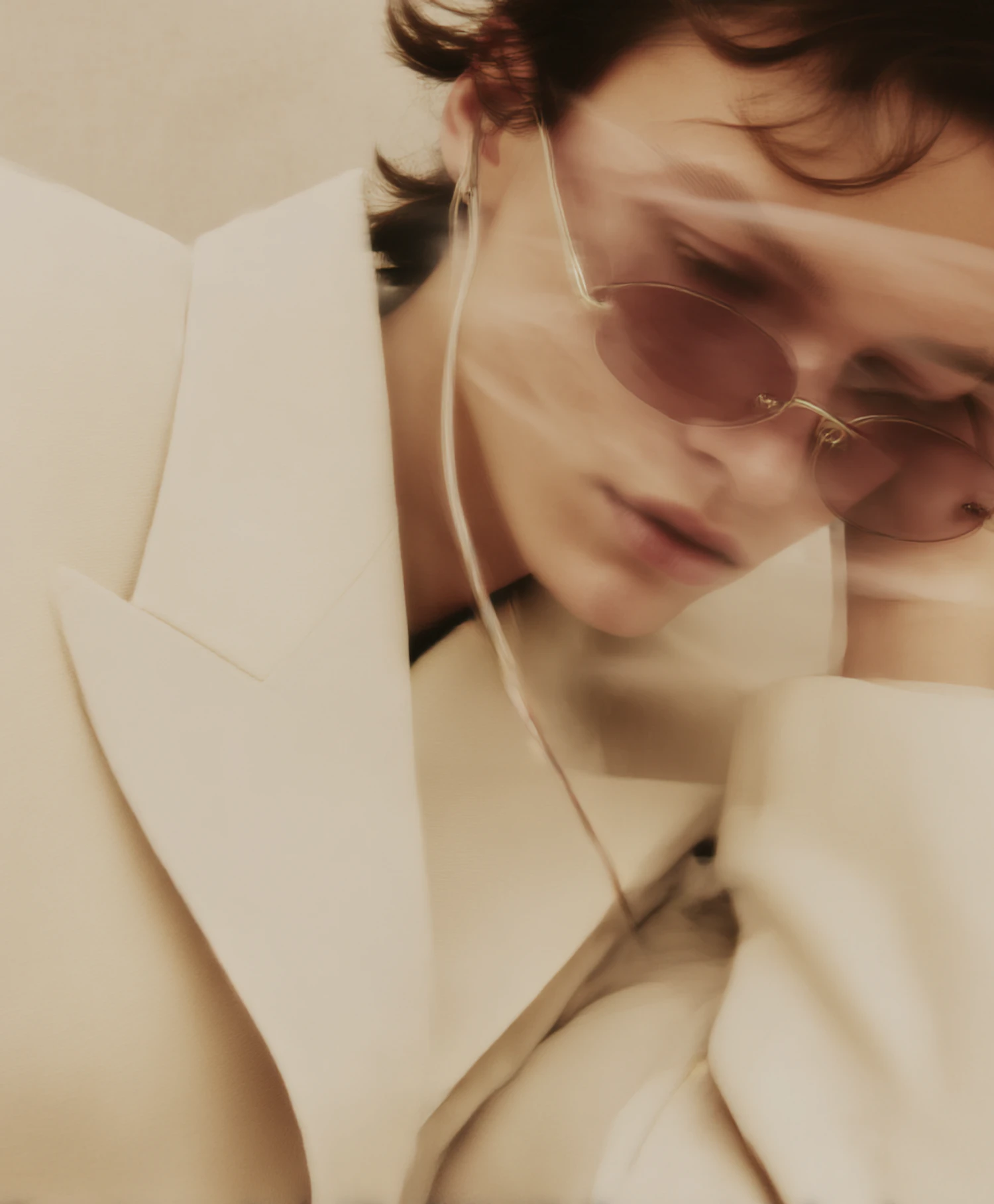 Artistic portrait of a person in a light suit and pink sunglasses, with a dreamy, blurred effect and warm, muted tones.