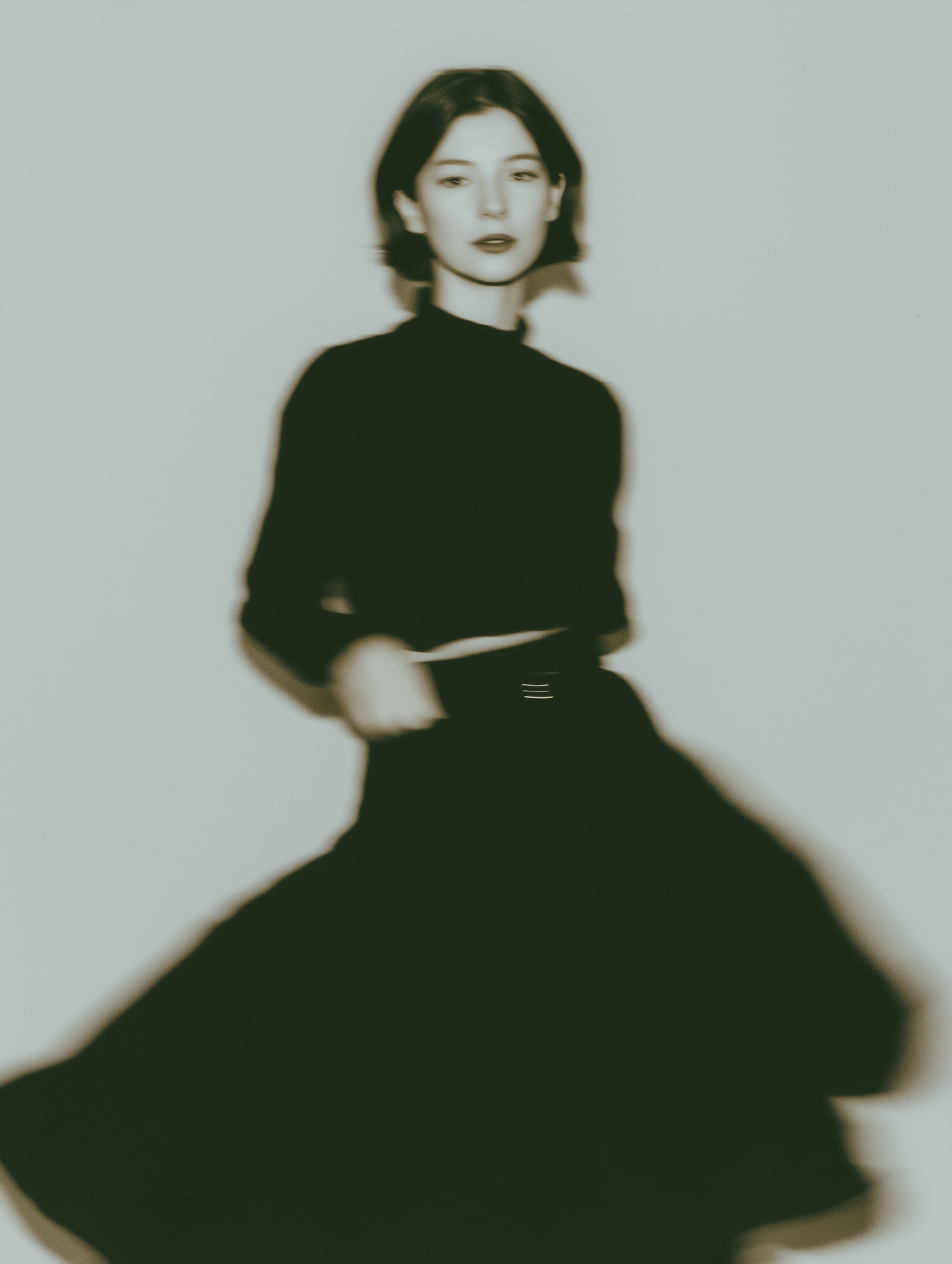 Artistic blurred photo of a person in a dark outfit, evoking a dreamy and abstract mood with soft focus and motion.