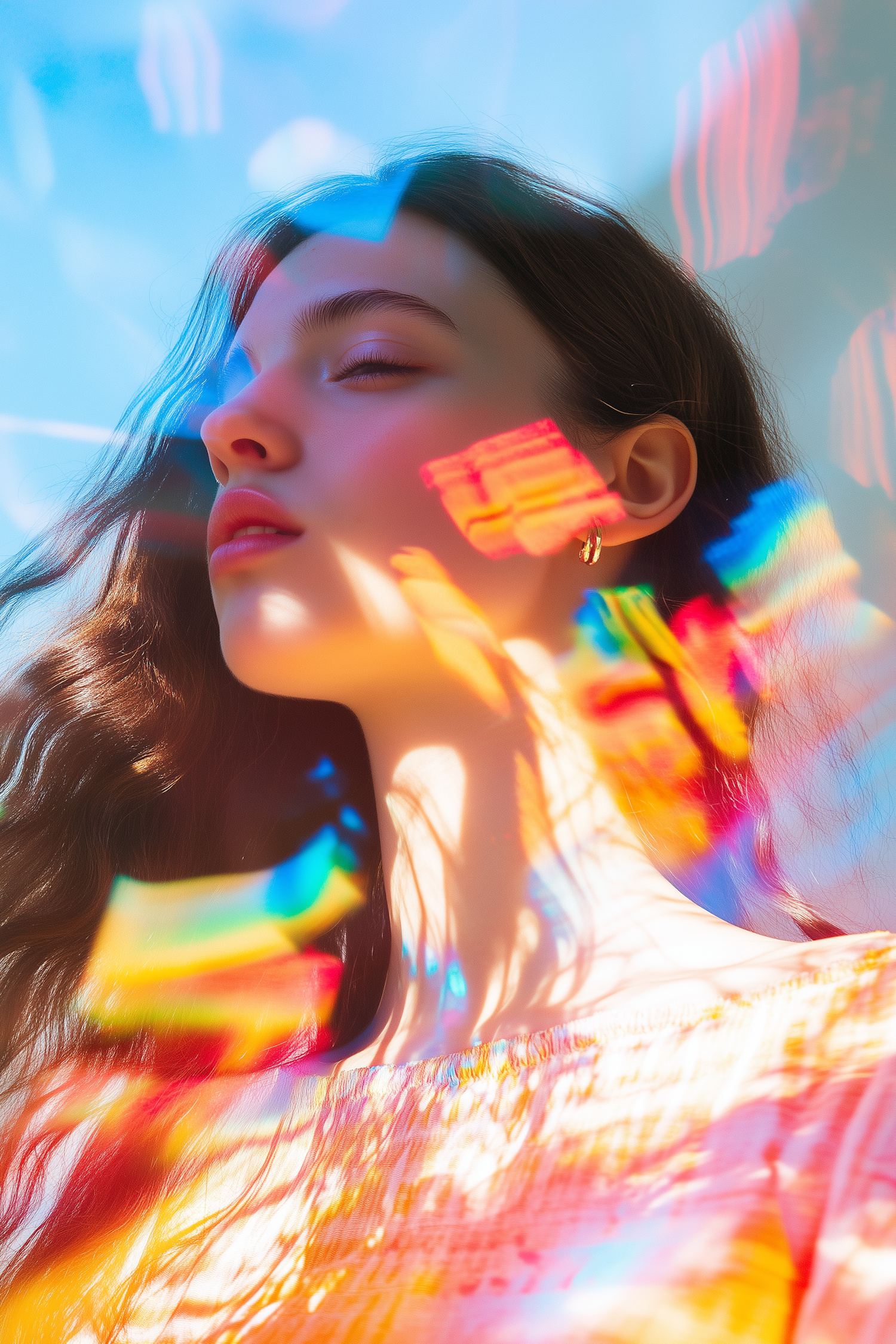 Dreamy portrait of a woman with rainbow light effects, closed eyes, and a serene expression against a clear blue sky.