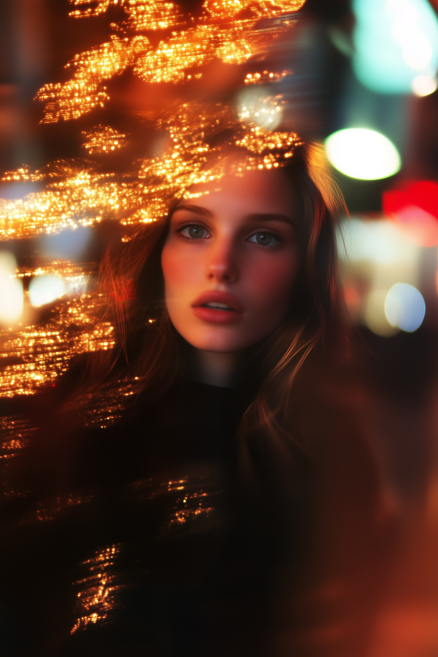 Ethereal portrait of a young woman with glowing lights and a dreamy urban background, creating a magical and captivating atmosphere.