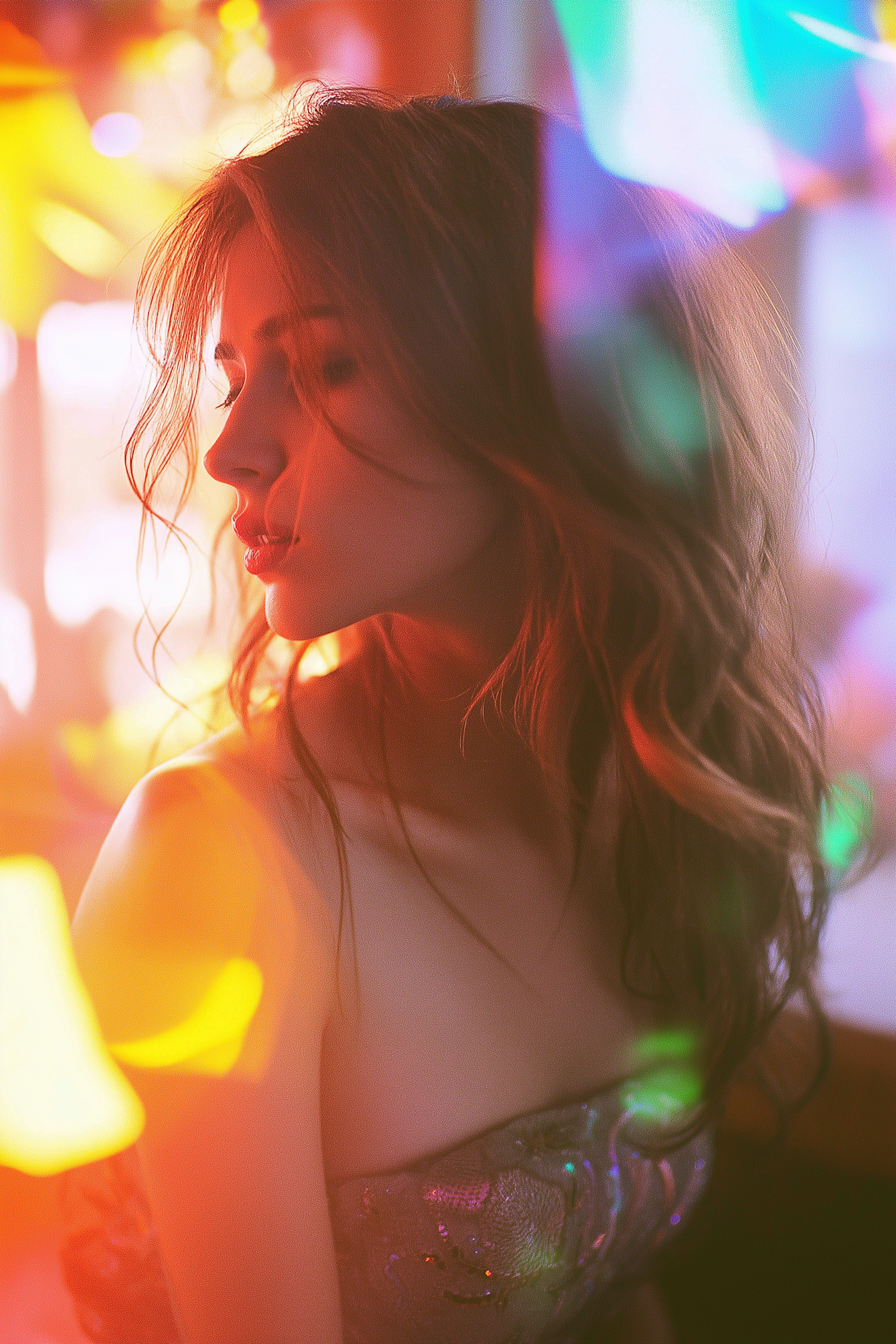 Dreamy portrait of a woman in soft light with colorful bokeh, wearing a shimmering dress and serene expression.
