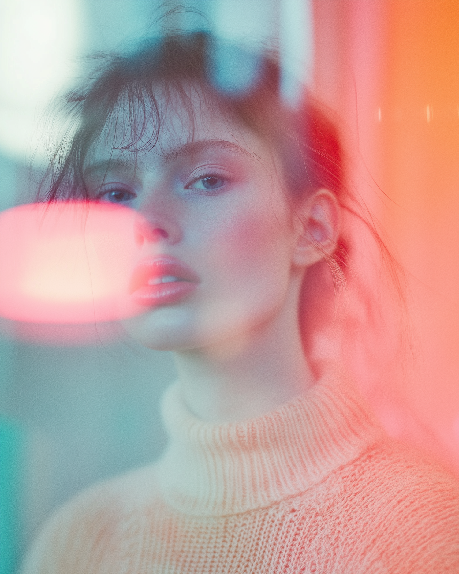 Dreamy portrait of a young woman in a peach sweater, surrounded by soft pink and blue hues, creating an ethereal and artistic effect.
