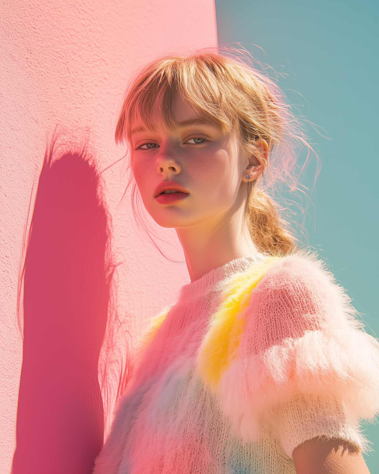 Young woman with blonde hair in a pastel sweater against a pink and teal background, creating a dreamy, ethereal vibe.