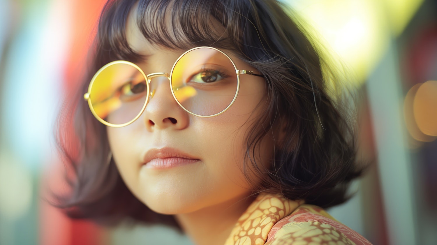 Young woman with round gold glasses and wavy hair, wearing a patterned outfit. Warm tones and vibrant blurred background.