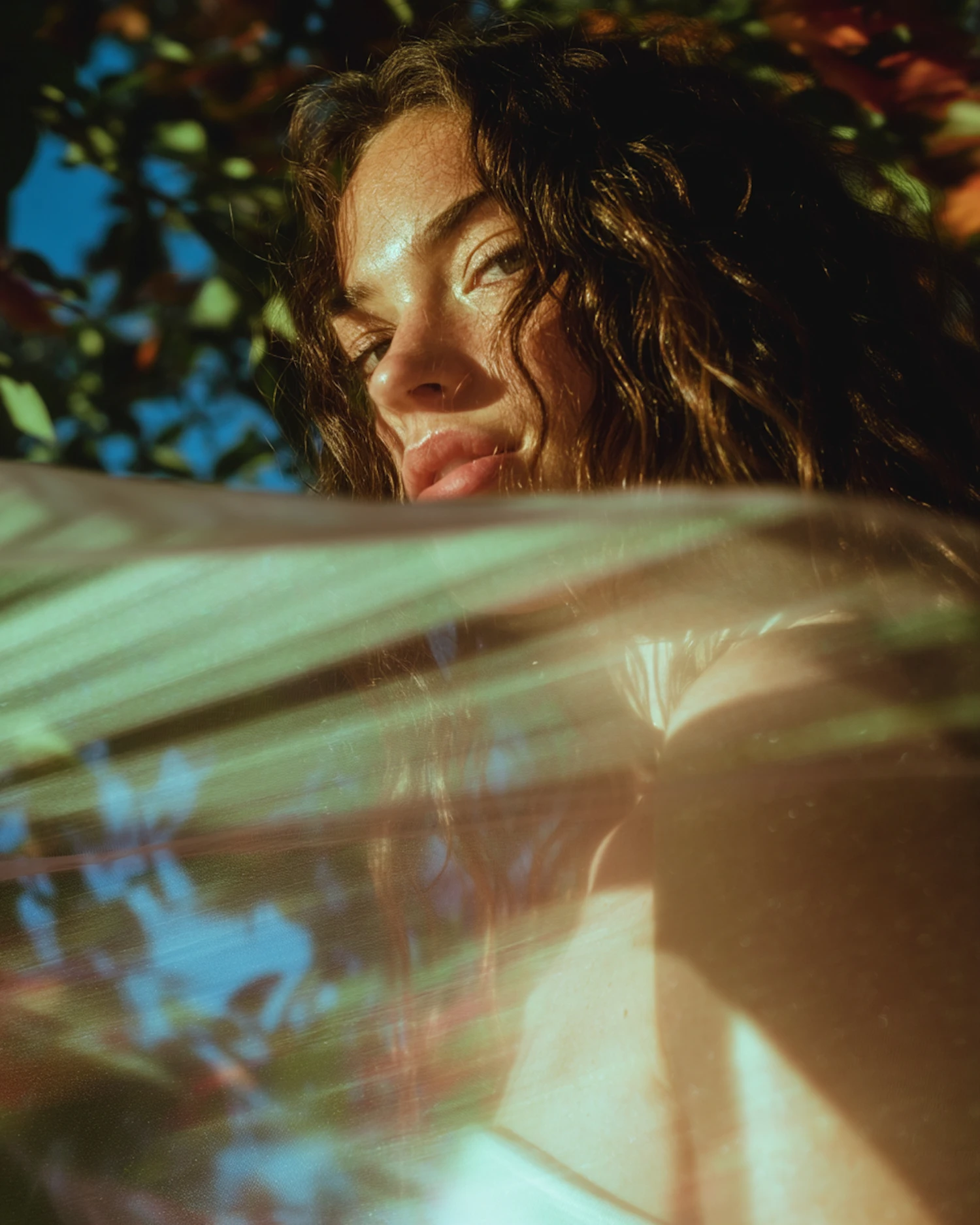 A close-up of a woman with wavy brown hair, sunlight on her face, and a dreamy overlay of light and foliage in the background.