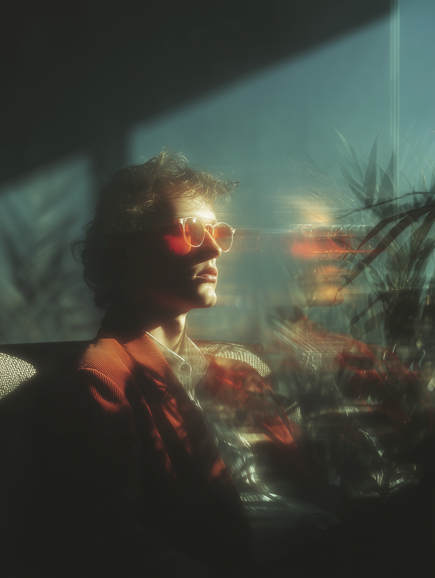 A person in a red jacket and orange sunglasses sits in soft, dreamy lighting with blurred greenery in the background.