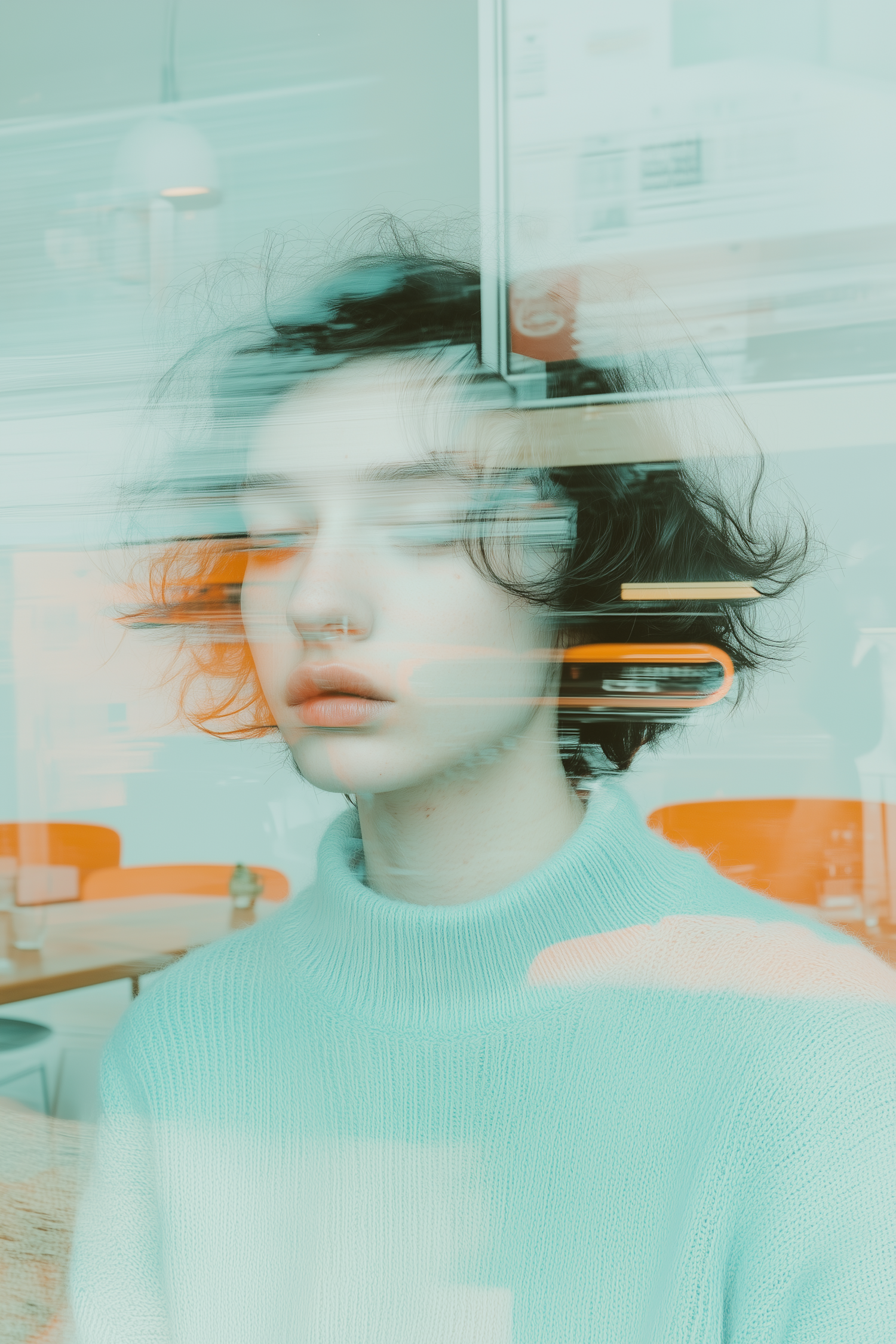 Dreamy portrait of a young woman with closed eyes, seen through a glass window with reflections and soft colors.