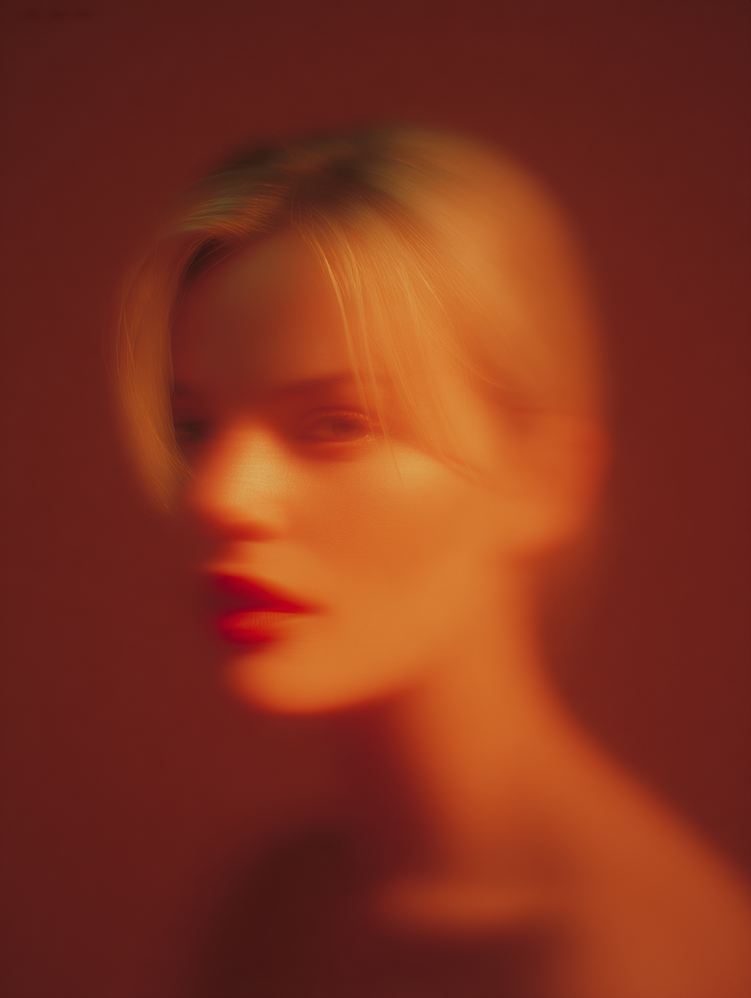 A blurred portrait of a person with blonde hair and red lips, set against a warm, reddish background, creating a dreamy and abstract effect.