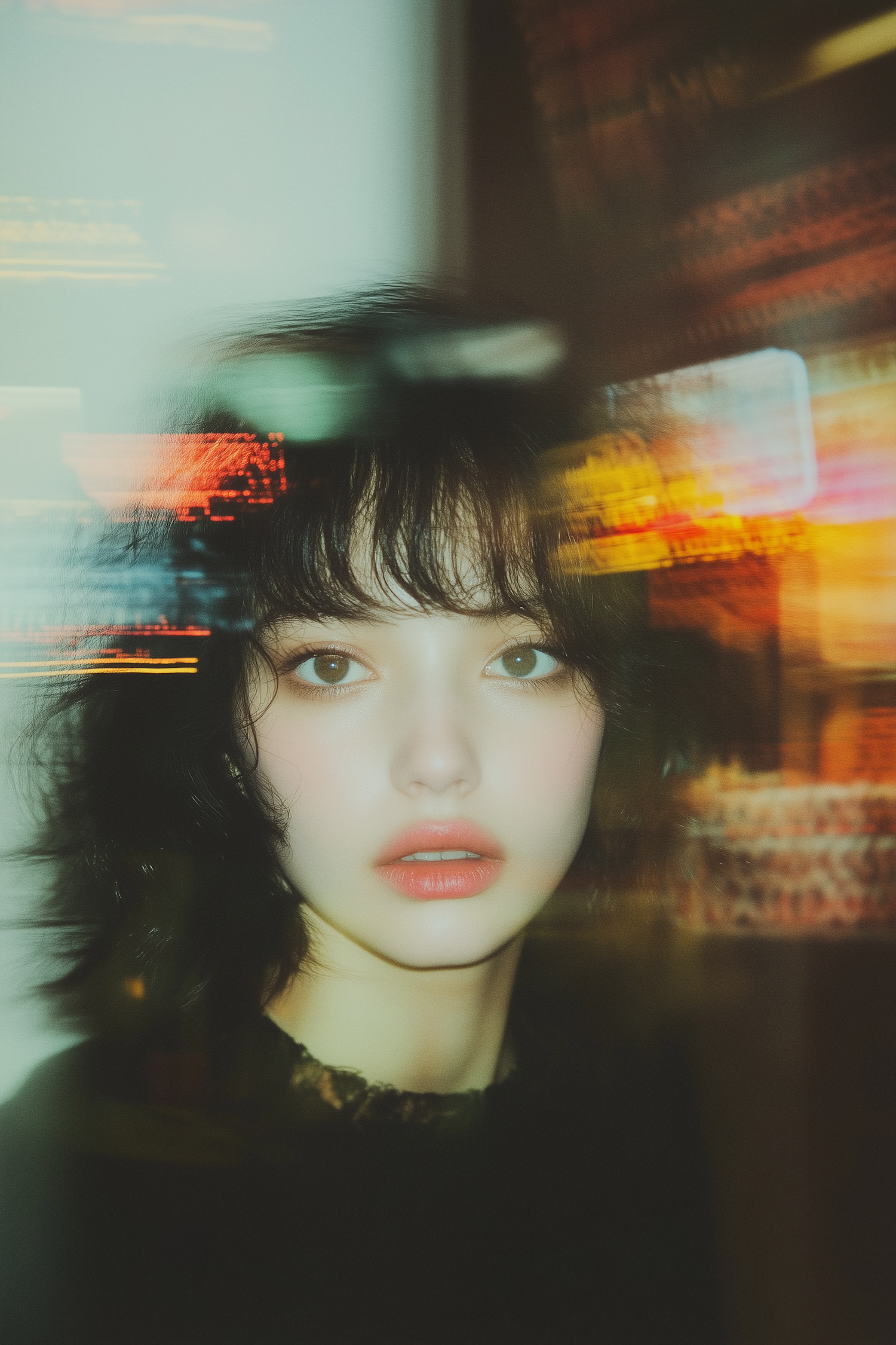 A dreamy portrait of a young woman with wavy black hair, light brown eyes, and a blurred background of colorful lights.