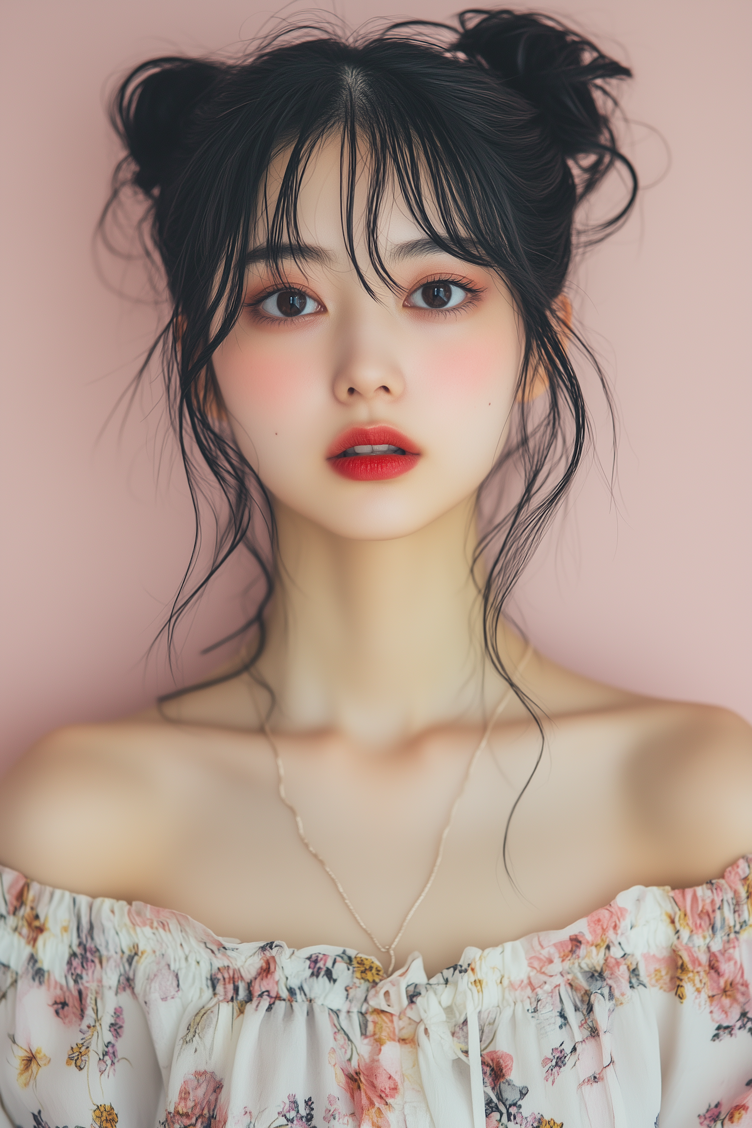 Young woman with dark hair in loose buns, wearing a floral off-shoulder dress and red lipstick against a soft pink background.