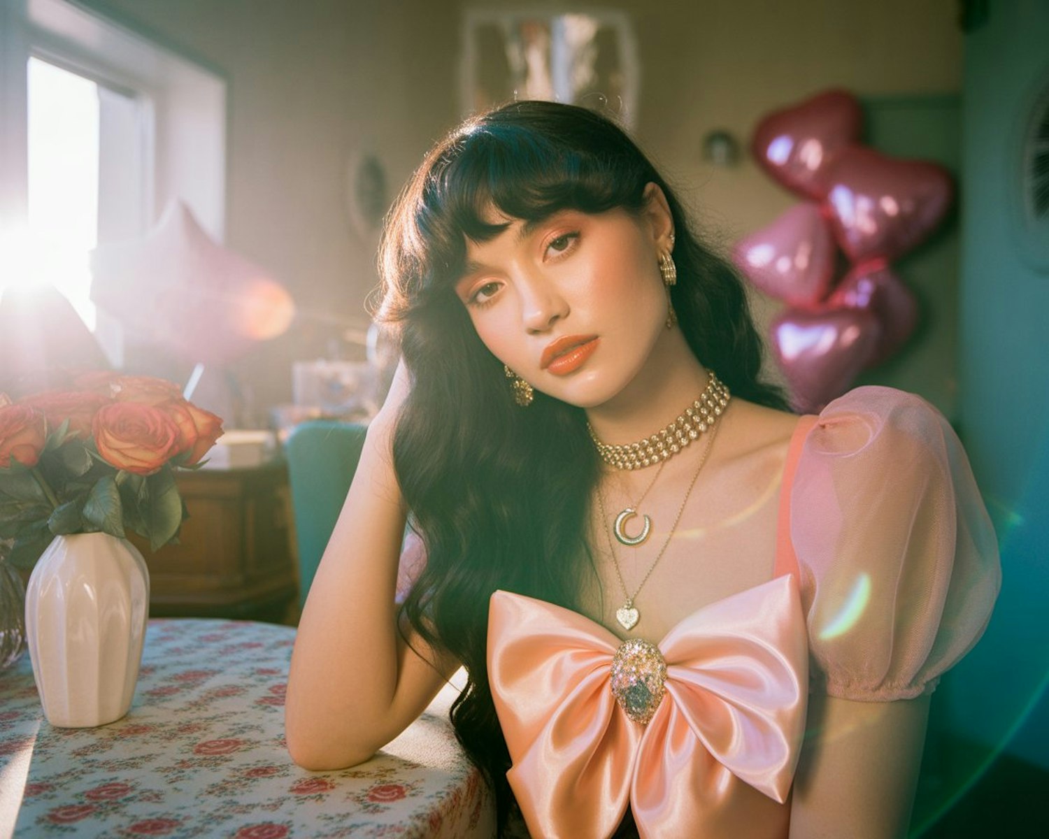 A young woman in a pink dress with a jeweled bow sits by a table with roses, bathed in warm sunlight and surrounded by heart balloons.