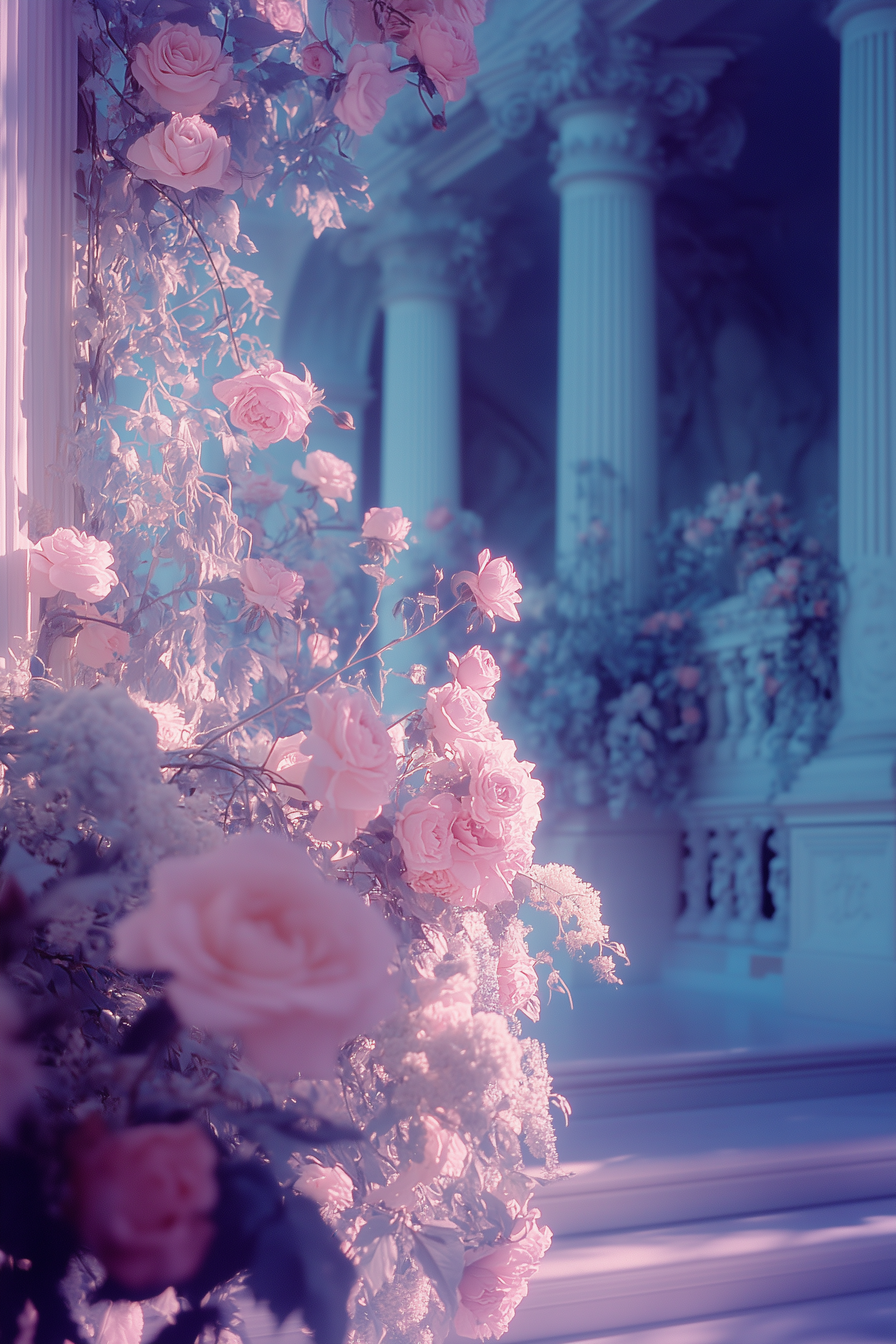 Dreamy pink roses cascade down a column in ethereal light, set against elegant classical architecture.