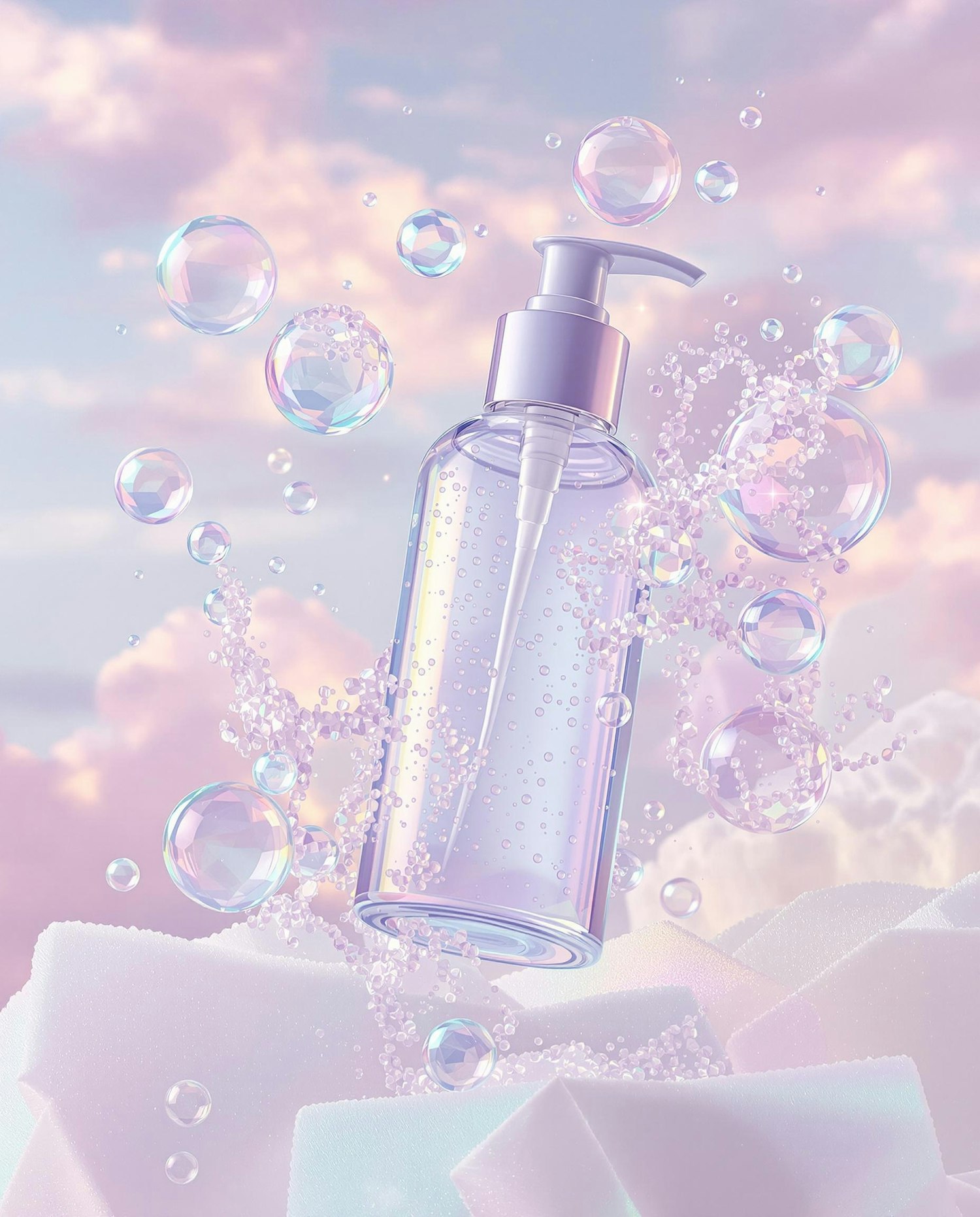 Experience the elegance of skincare with this pastel-themed product image, featuring bubbles and a delicate gradient sky.