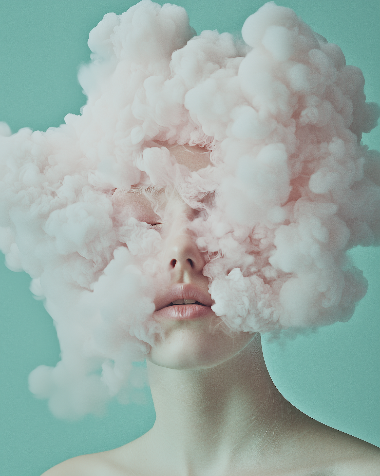 A surreal portrait of a person with soft white smoke obscuring their face, set against a muted teal background. Dreamy and ethereal vibes.