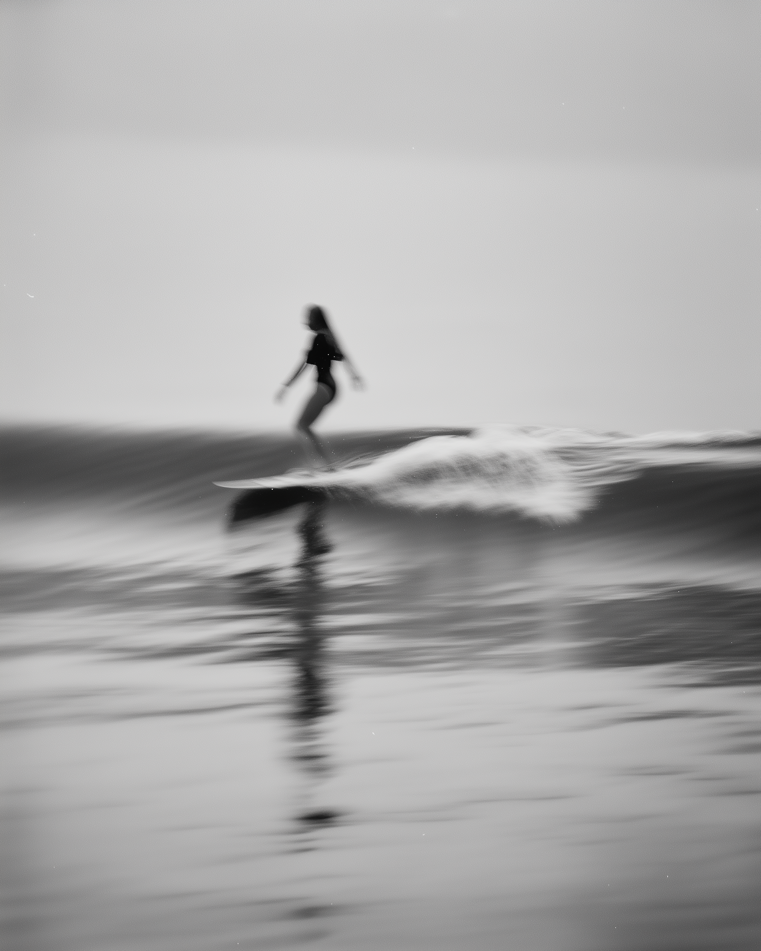 Dreamy black-and-white shot of a surfer balancing on a wave, with motion blur creating a serene and timeless vibe.