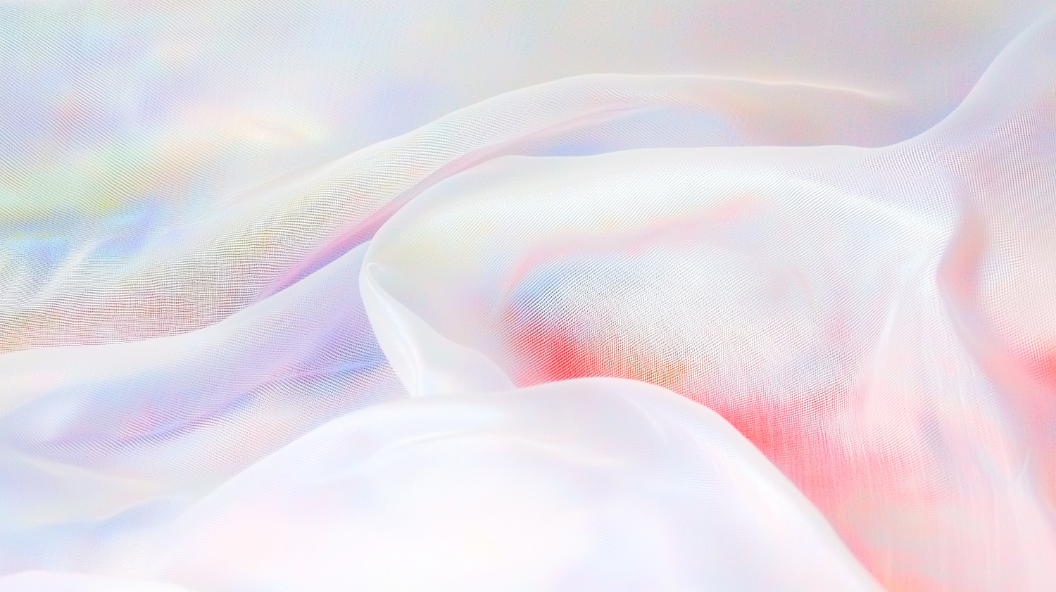 Dreamy pastel fabric with iridescent hues of pink, blue, and yellow, creating a soft, ethereal texture and flowing movement.
