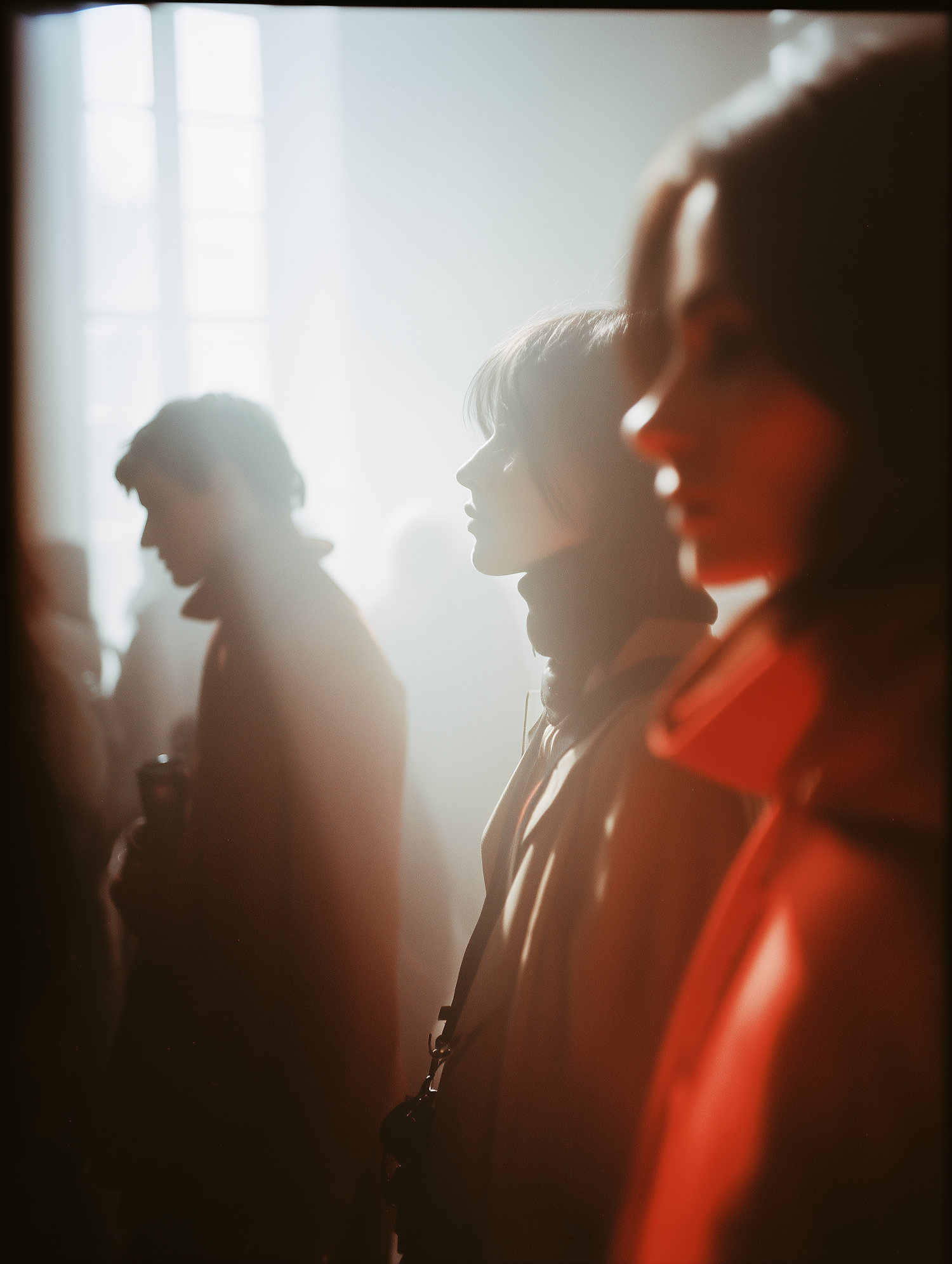 A hazy, sunlit scene with three individuals in soft focus, evoking a dreamy and contemplative atmosphere.