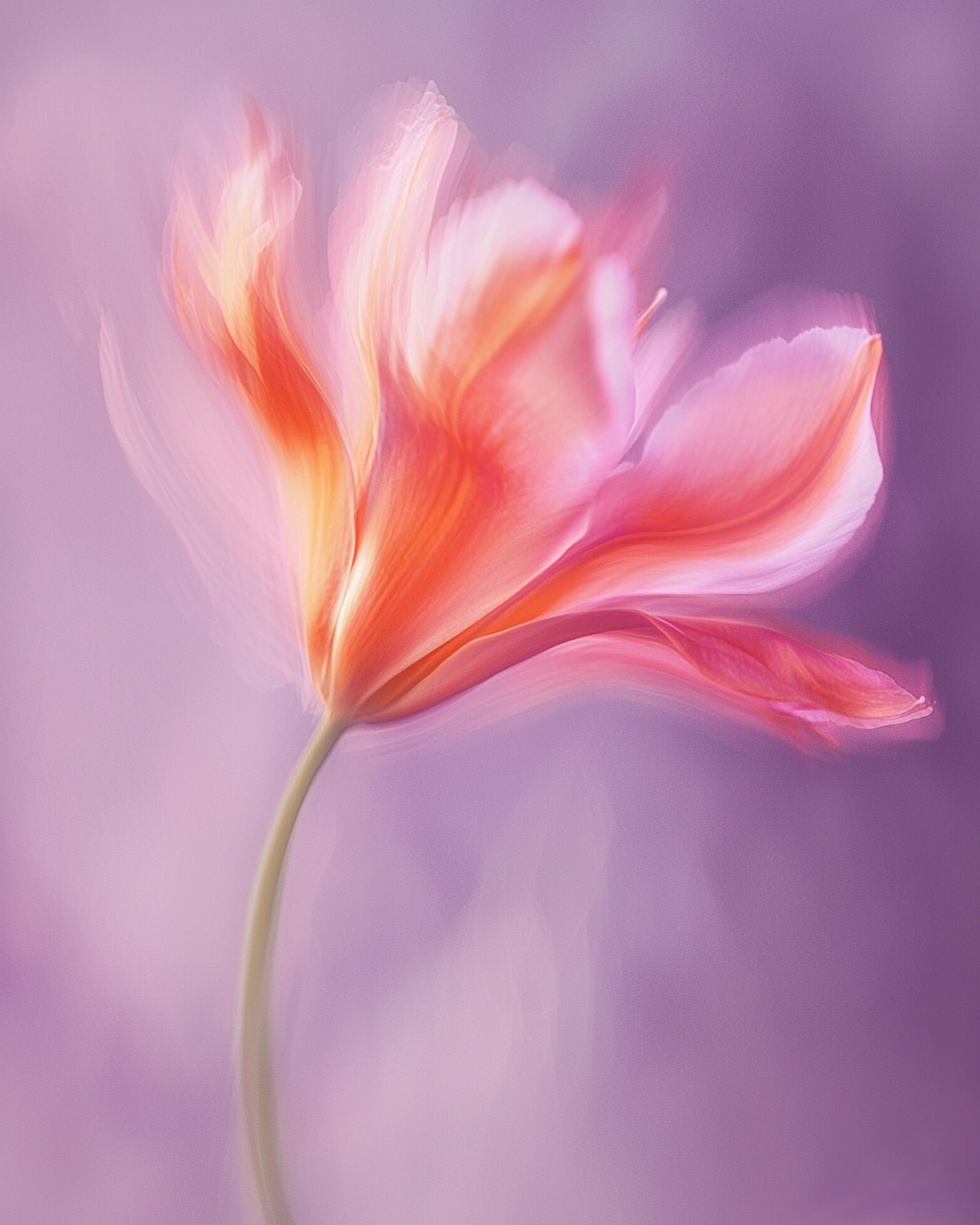 A dreamy tulip with flowing pink and orange petals against a soft lavender background, creating an ethereal and artistic vibe.