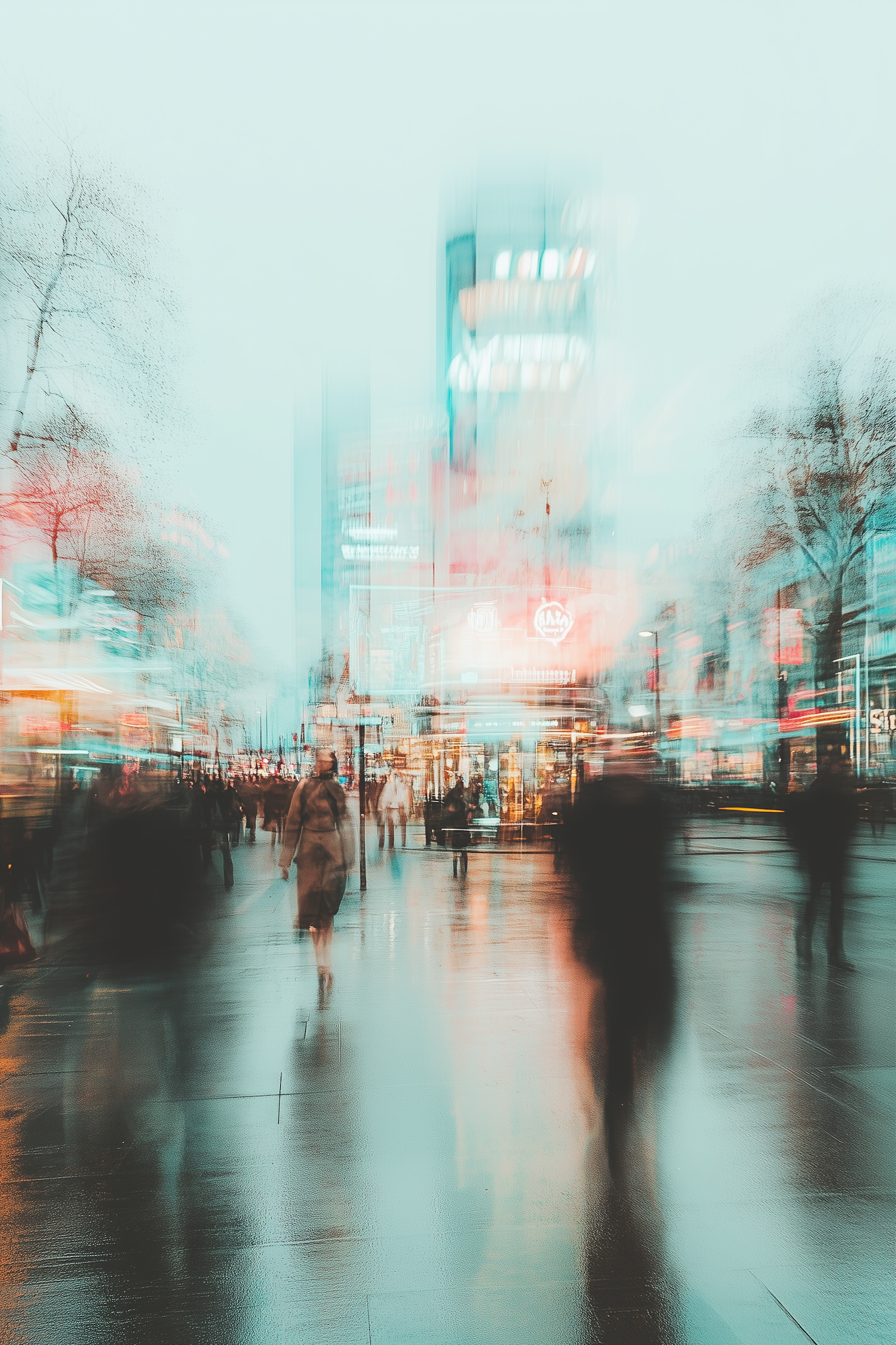 Dreamy urban street scene with blurred figures, neon lights, and wet reflections creating a surreal, ethereal atmosphere.