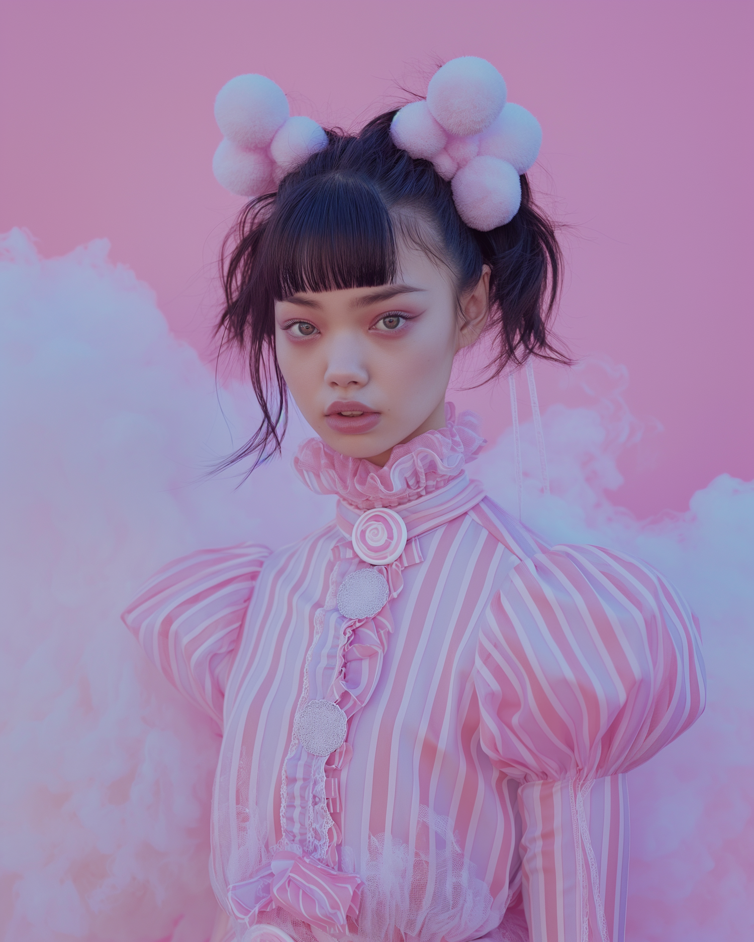 Whimsical portrait of a young woman in pastel pink attire with candy-themed details, set against a dreamy pink cloud-like background.