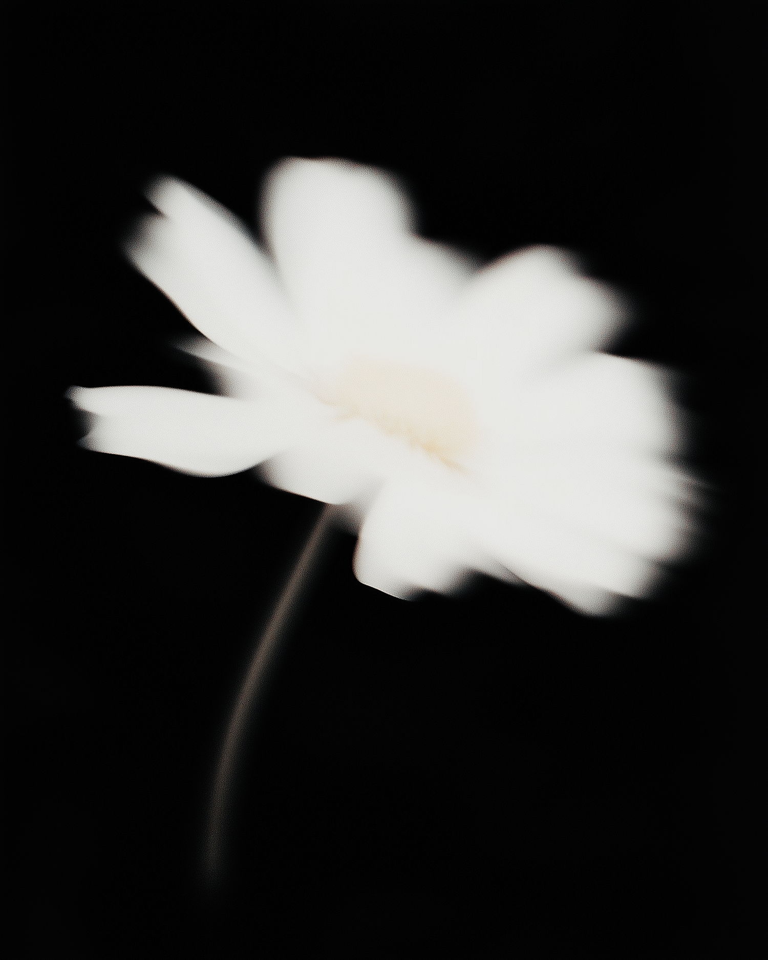 A dreamy, soft-focus white daisy on a black background, creating a minimalistic and ethereal aesthetic.