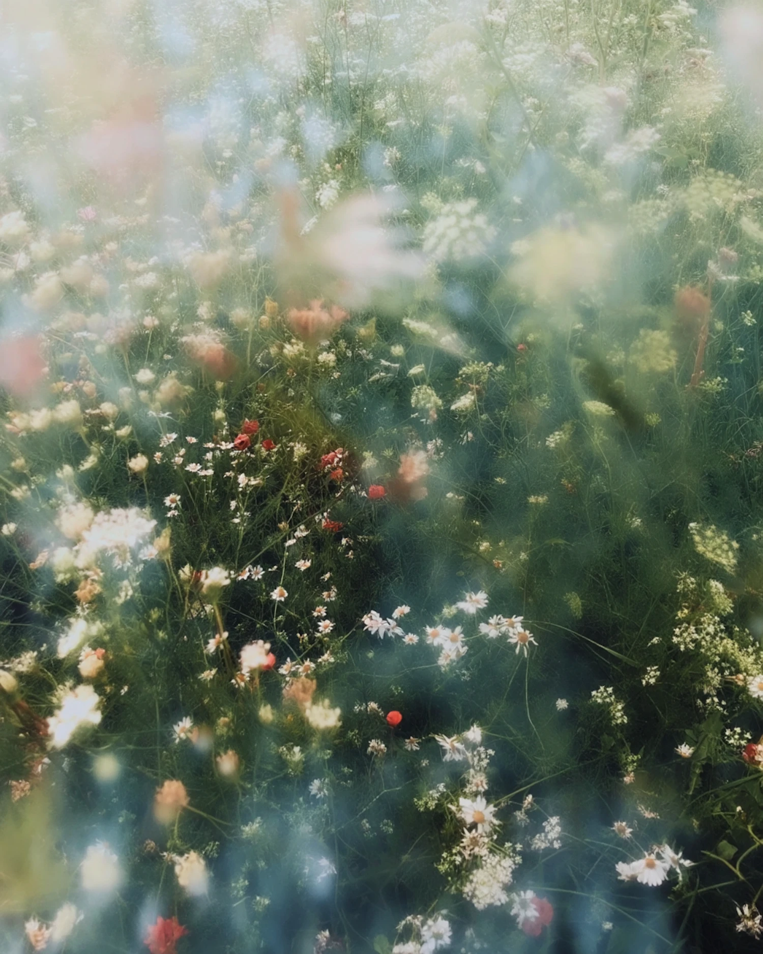 A serene meadow with colorful wildflowers in soft focus, creating a dreamy and tranquil atmosphere with a hazy light effect.
