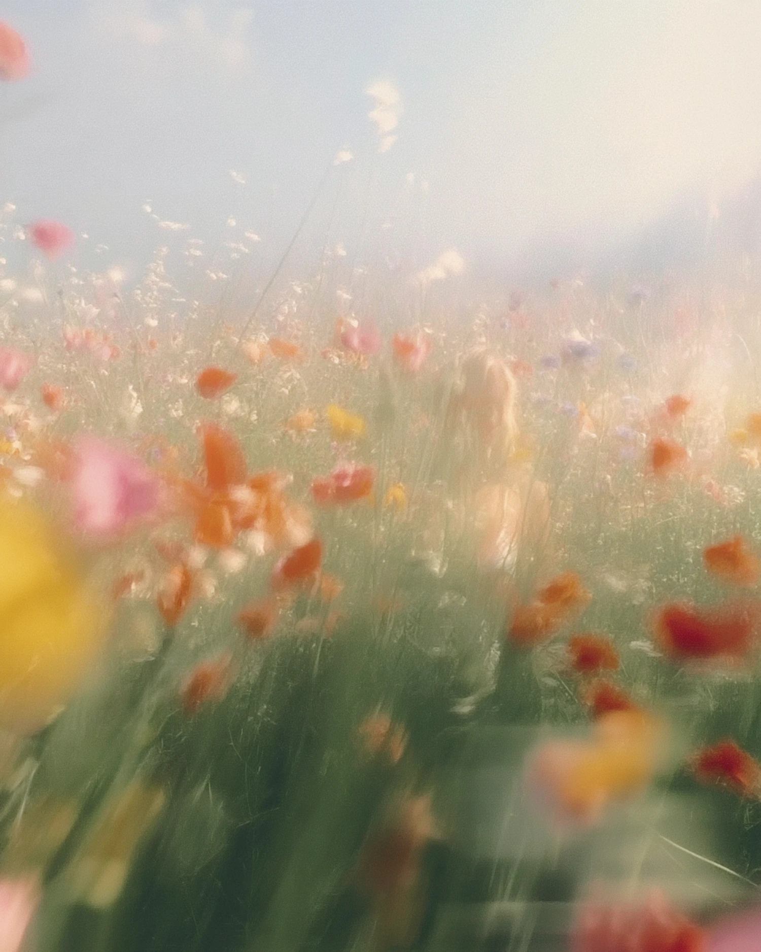 A dreamy meadow with colorful wildflowers and soft sunlight, featuring a faint silhouette of a person in the background.