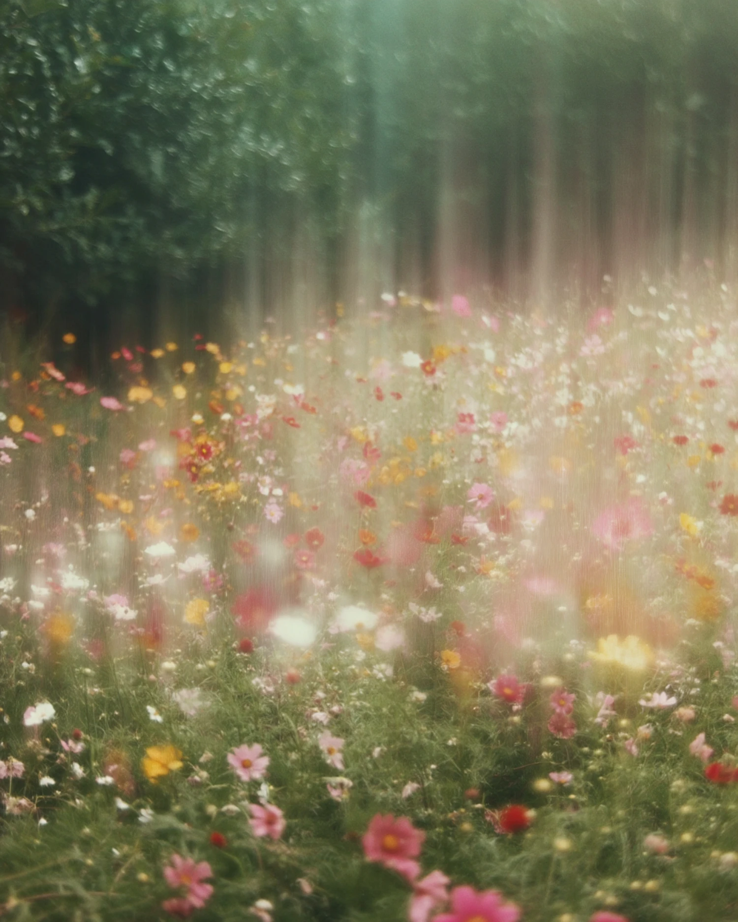 A dreamy meadow of colorful wildflowers under a soft, ethereal glow, with a blurred forest in the background creating a serene atmosphere.
