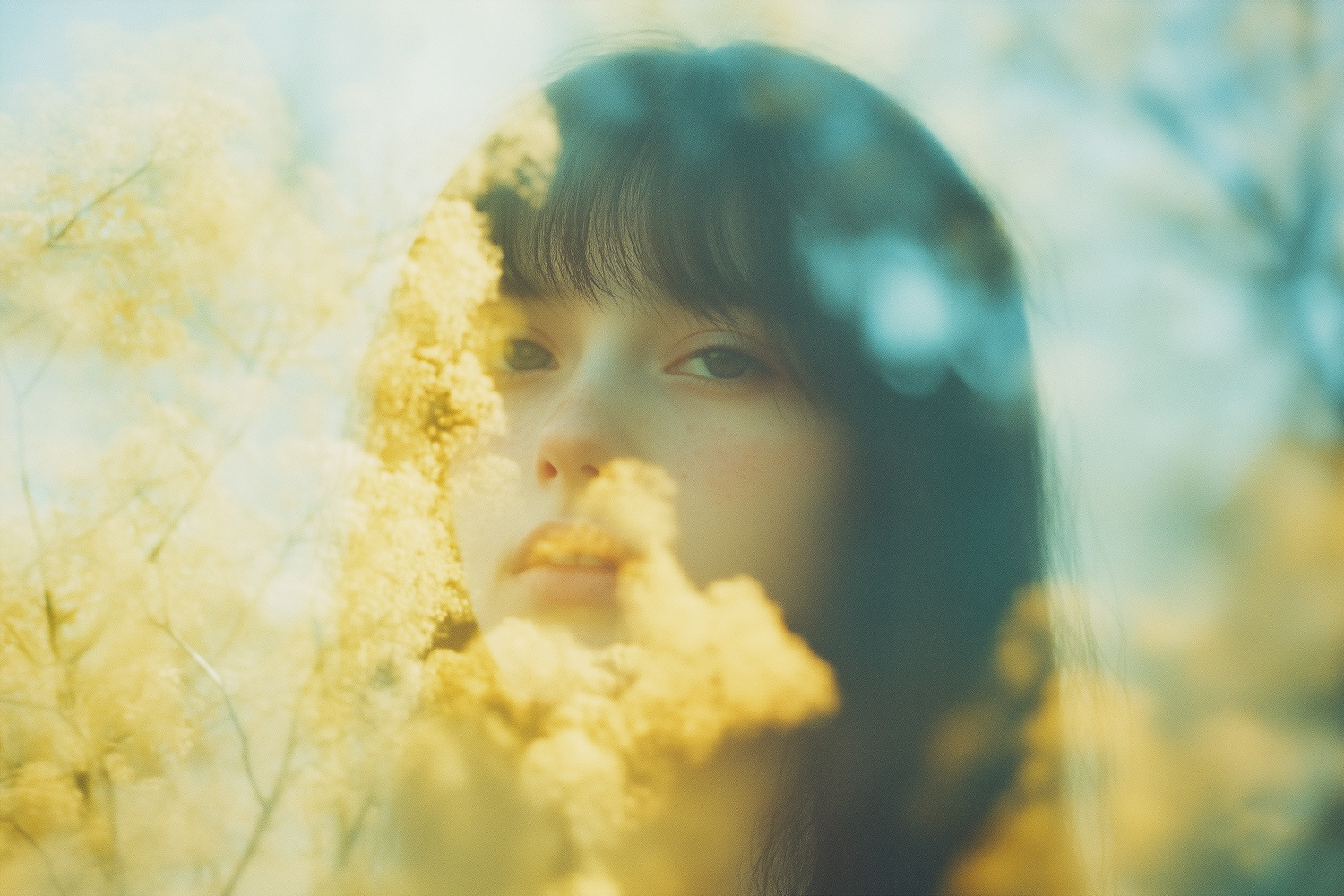 Dreamy portrait of a woman with dark hair and green eyes, framed by soft yellow flowers and a serene, blurred background.