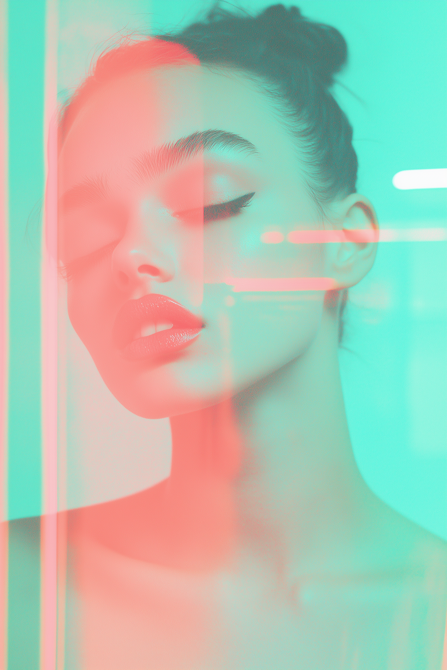Dreamy portrait of a woman with teal and pink tones, closed eyes, winged eyeliner, and glossy lips, creating a futuristic aesthetic.