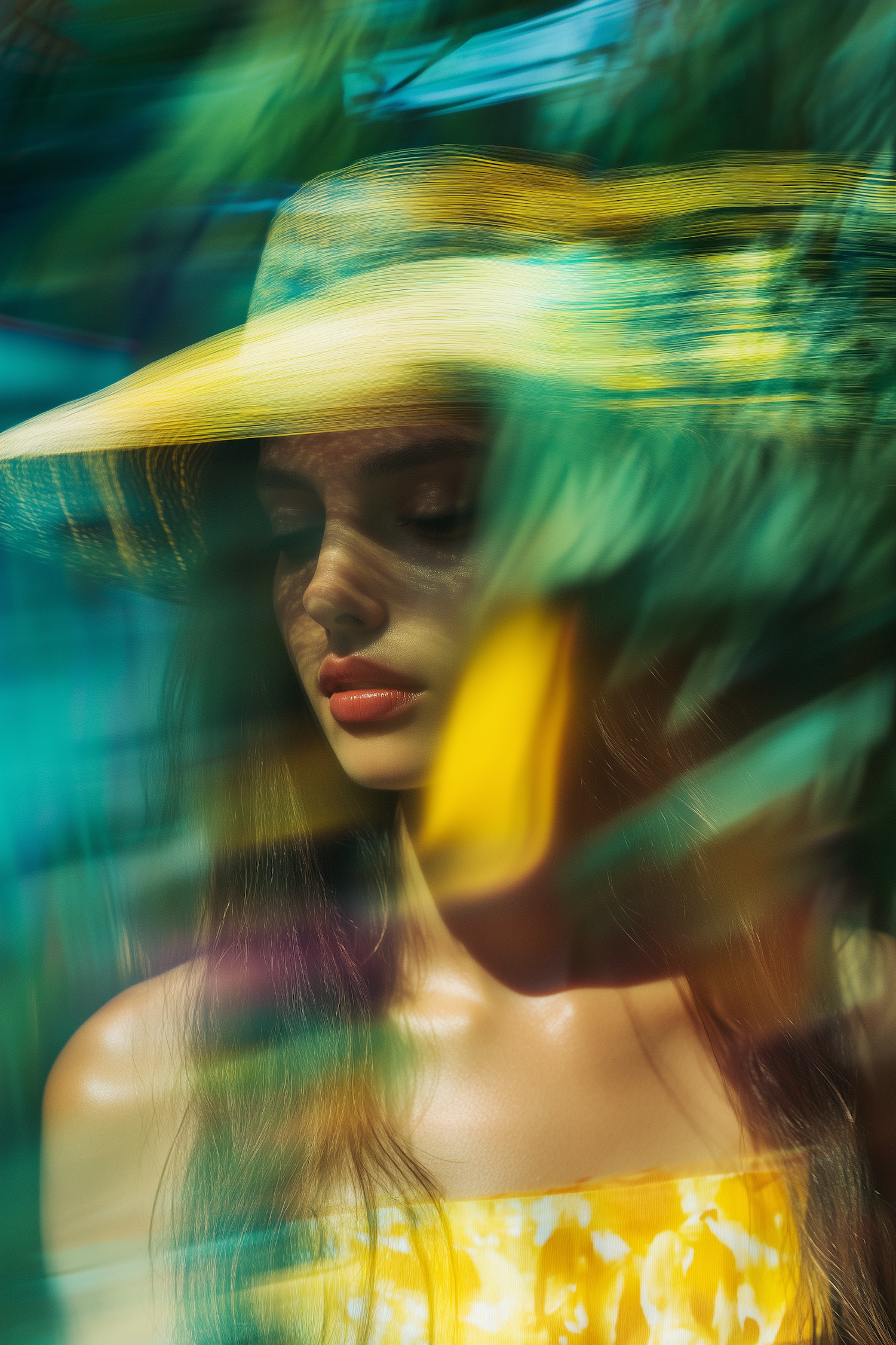 A serene woman in a yellow hat and dress, surrounded by blurred green and yellow foliage, creating a dreamy, artistic vibe.
