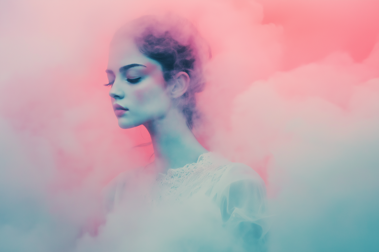 Dreamy portrait of a woman in soft pink and blue smoke, wearing a white lace top, with a calm and introspective expression.