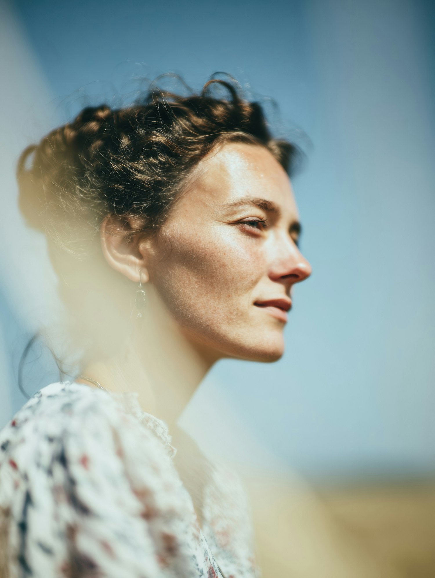 Side profile of a woman with curly hair in natural light, set against a clear blue sky. Dreamy and artistic outdoor portrait.