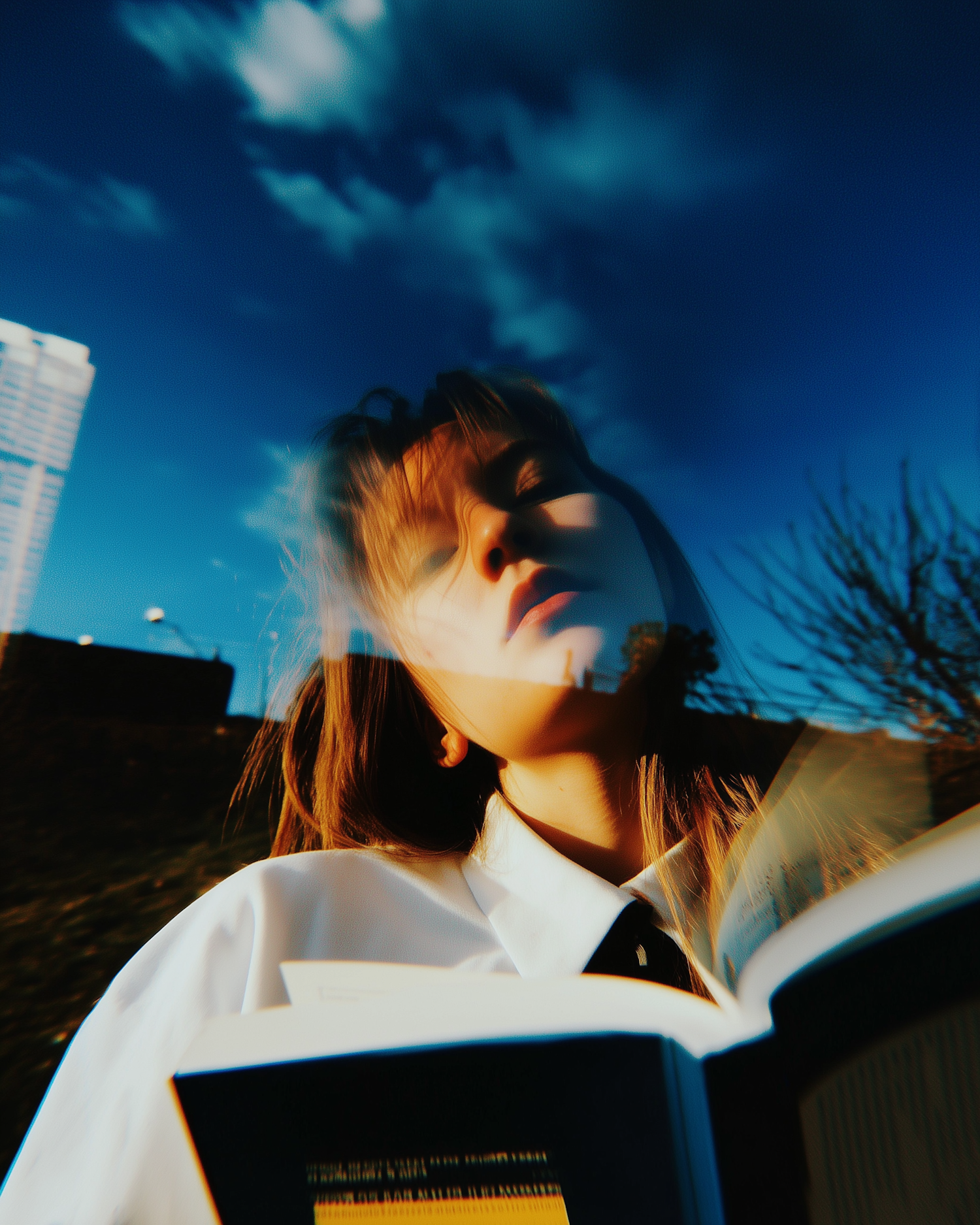 Dreamy portrait of a woman reading outdoors, with warm sunlight, a vivid blue sky, and artistic distortions creating a surreal vibe.