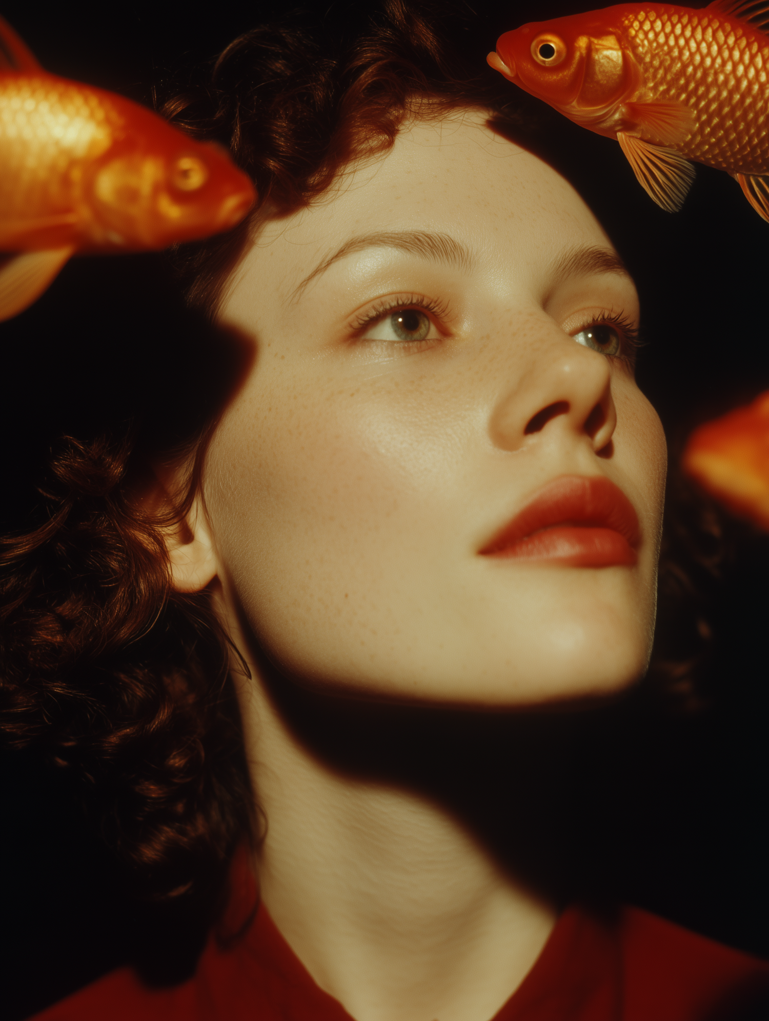 Dreamy portrait of a freckled woman with goldfish swimming around her, set against a dark background with warm, soft lighting.