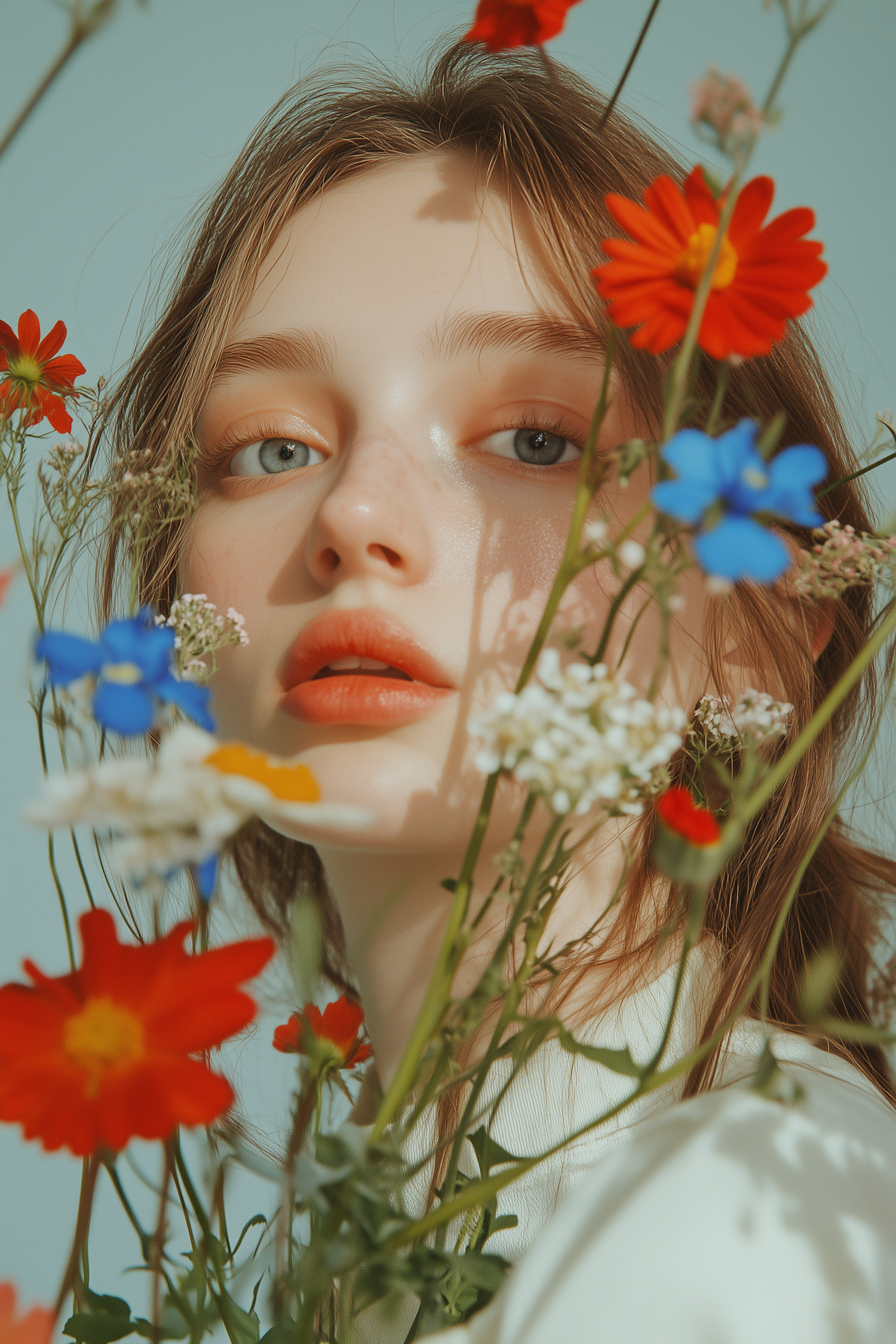 A dreamy portrait of a young woman surrounded by vibrant wildflowers, with soft lighting and a muted blue background.