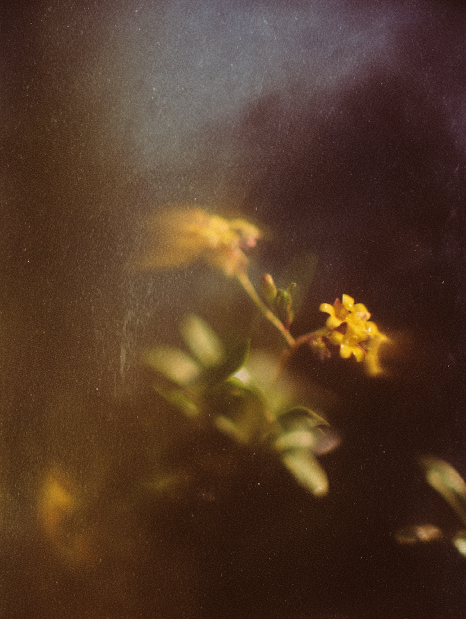 Dreamy close-up of a yellow flower with green leaves, softly blurred against a dark, textured background.