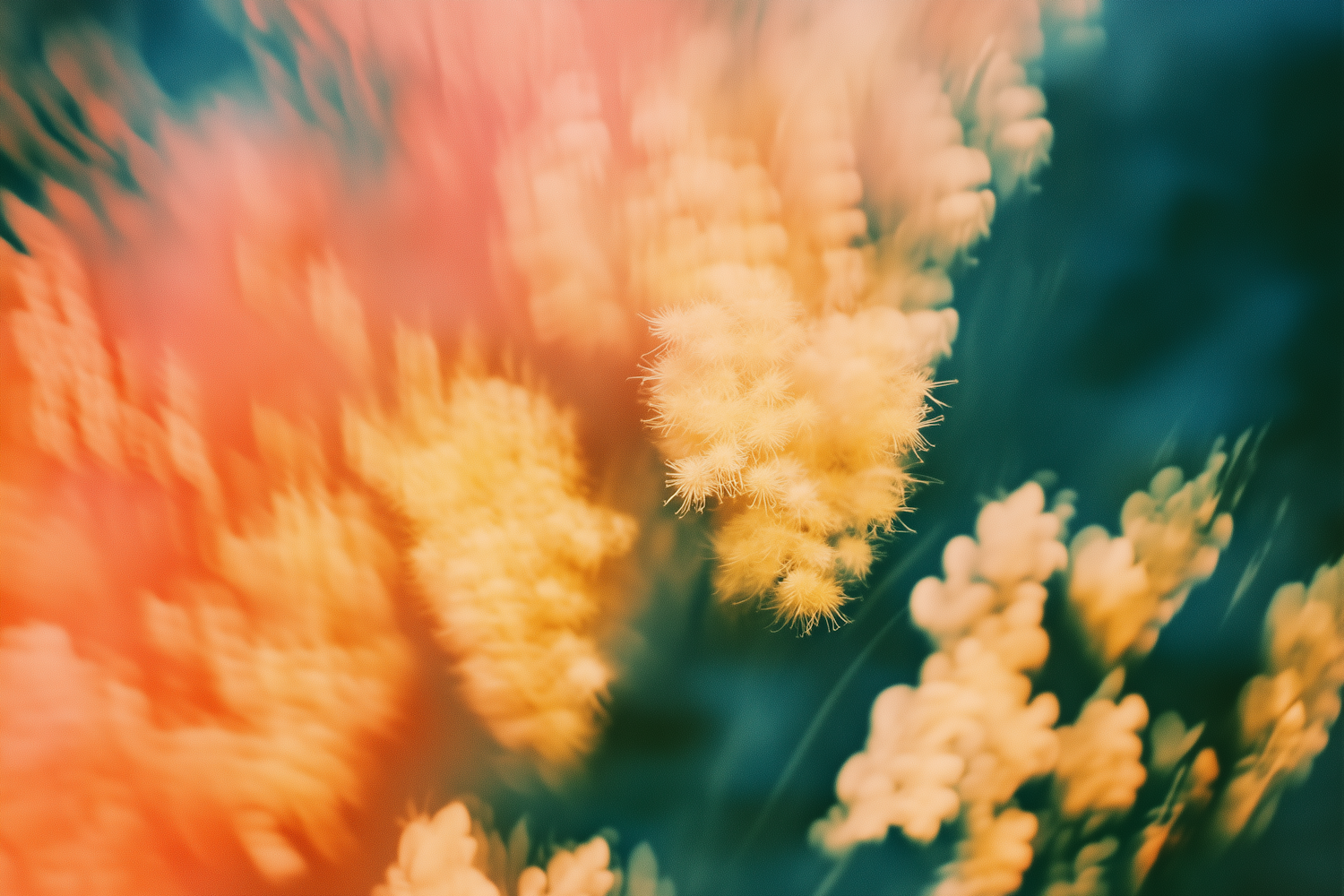 Dreamy close-up of fluffy yellow flowers with warm orange tones and a blurred green background, creating a soft, ethereal vibe.